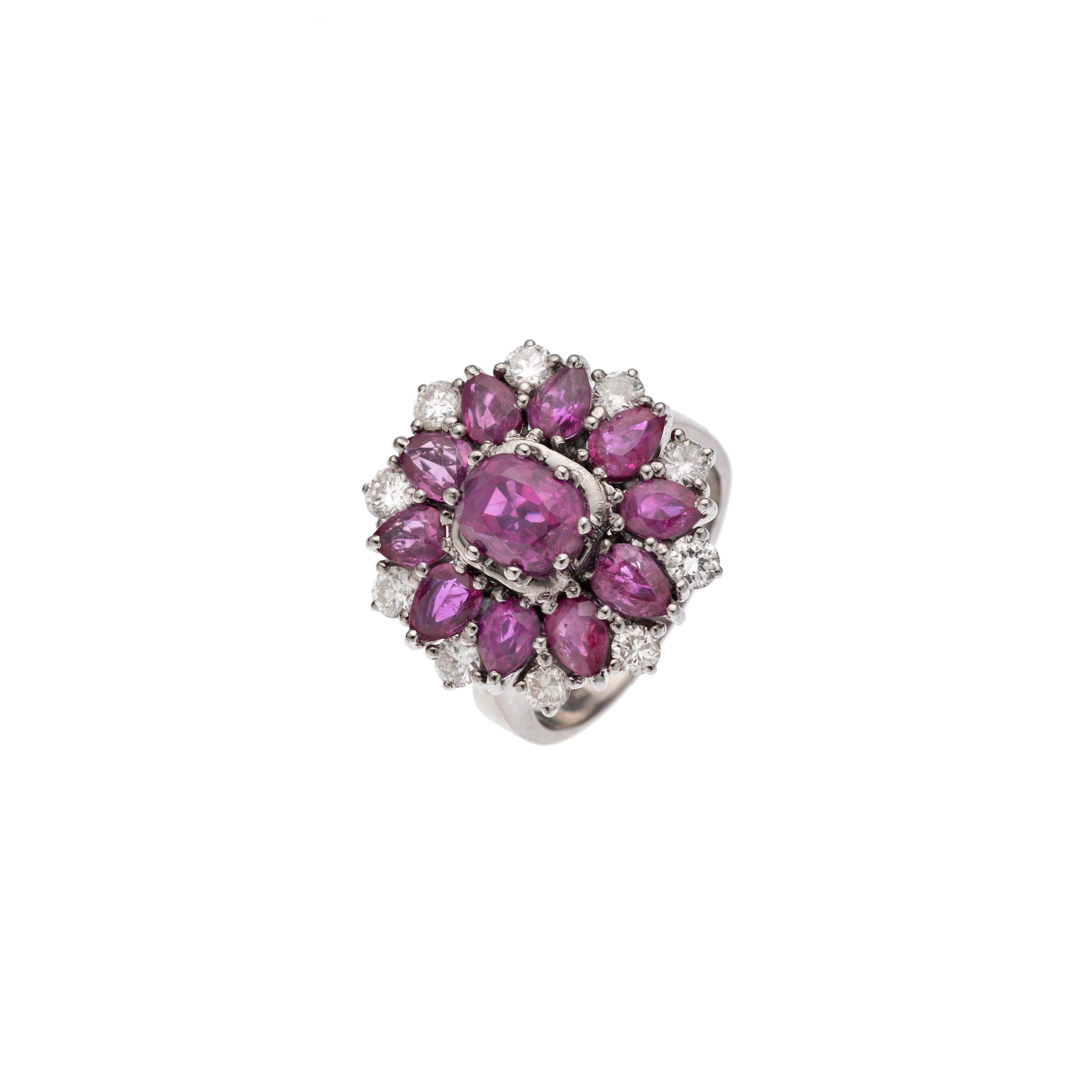 Dieser Cocktailring aus den 1930er Jahren besticht durch seine außergewöhnlichen Burma-Rubine von seltener Qualität, unbehandelt („no heat“). Im Zentrum steht ein ovaler Rubin, der in acht Krappen gefasst ist. Ihn umgibt eine Komposition aus zehn tropfenförmigen Rubinen, zwischen denen jeweils ein Brillant gesetzt ist.