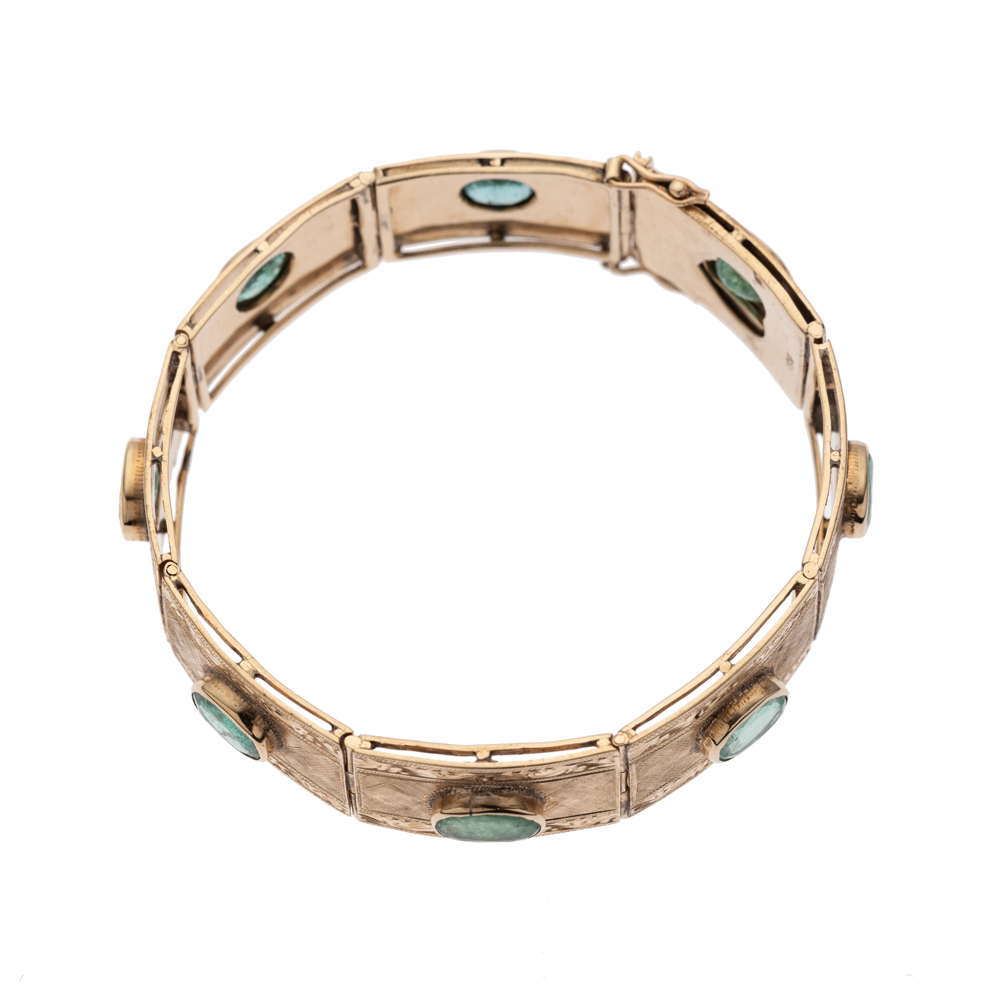 Das aus 750/- Gelbgold gefertigte Armband besticht durch seinen kunstvoll gearbeiteten Rankenfries, der sich harmonisch über die gesamte Länge zieht und die achteckigen Elemente anmutig einrahmt. Im Zentrum jedes Elements funkelt ein ovaler, facettierter Smaragd, der sich lebendig vom fein guillochierten Hintergrund abhebt.