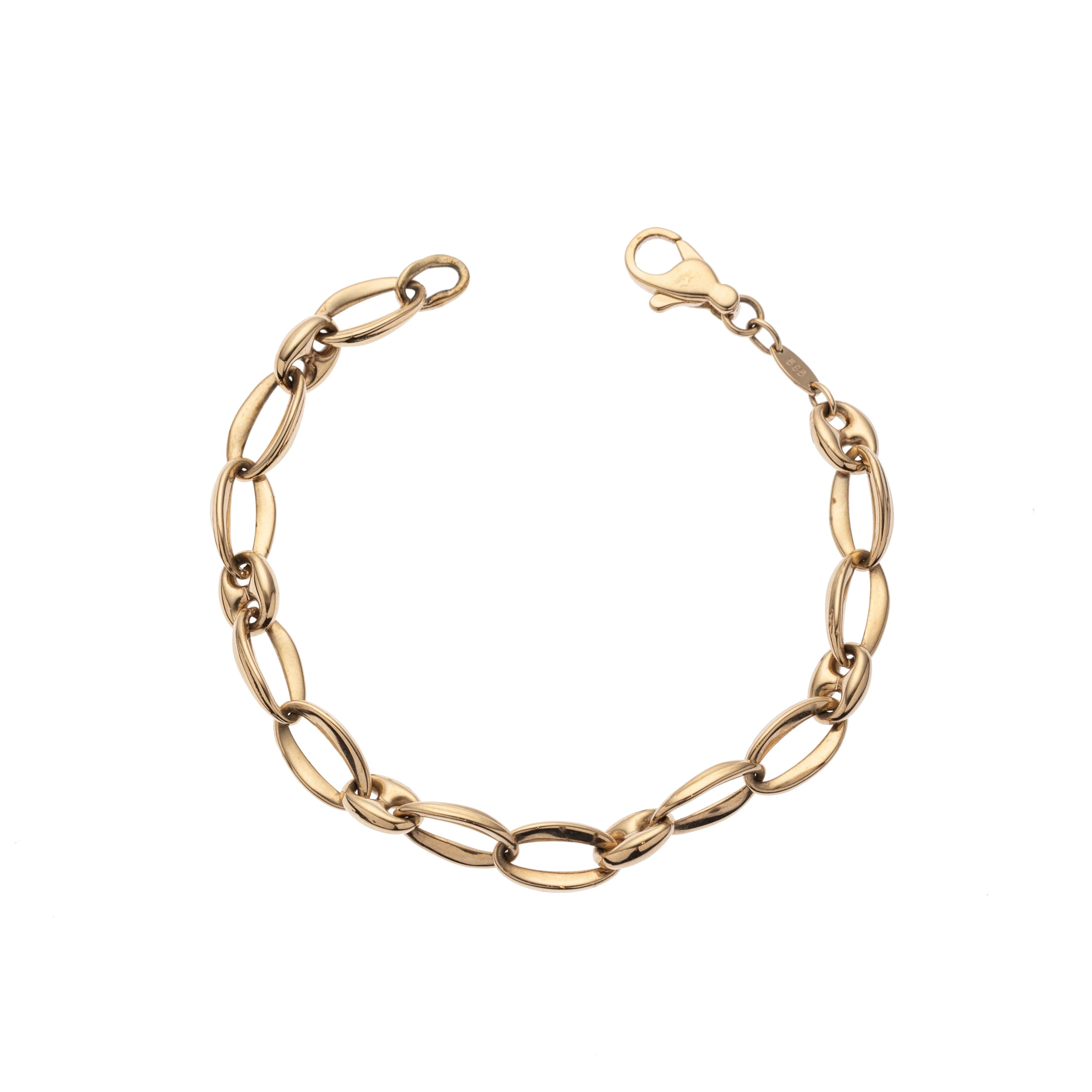 Das feine Armband aus 585/- Gelbgold kombiniert in harmonischem Wechsel Marina-Elemente mit offenen Ankergliedern und lässt sich über einen schlichten Karabinerverschluss bequem an- und ablegen.