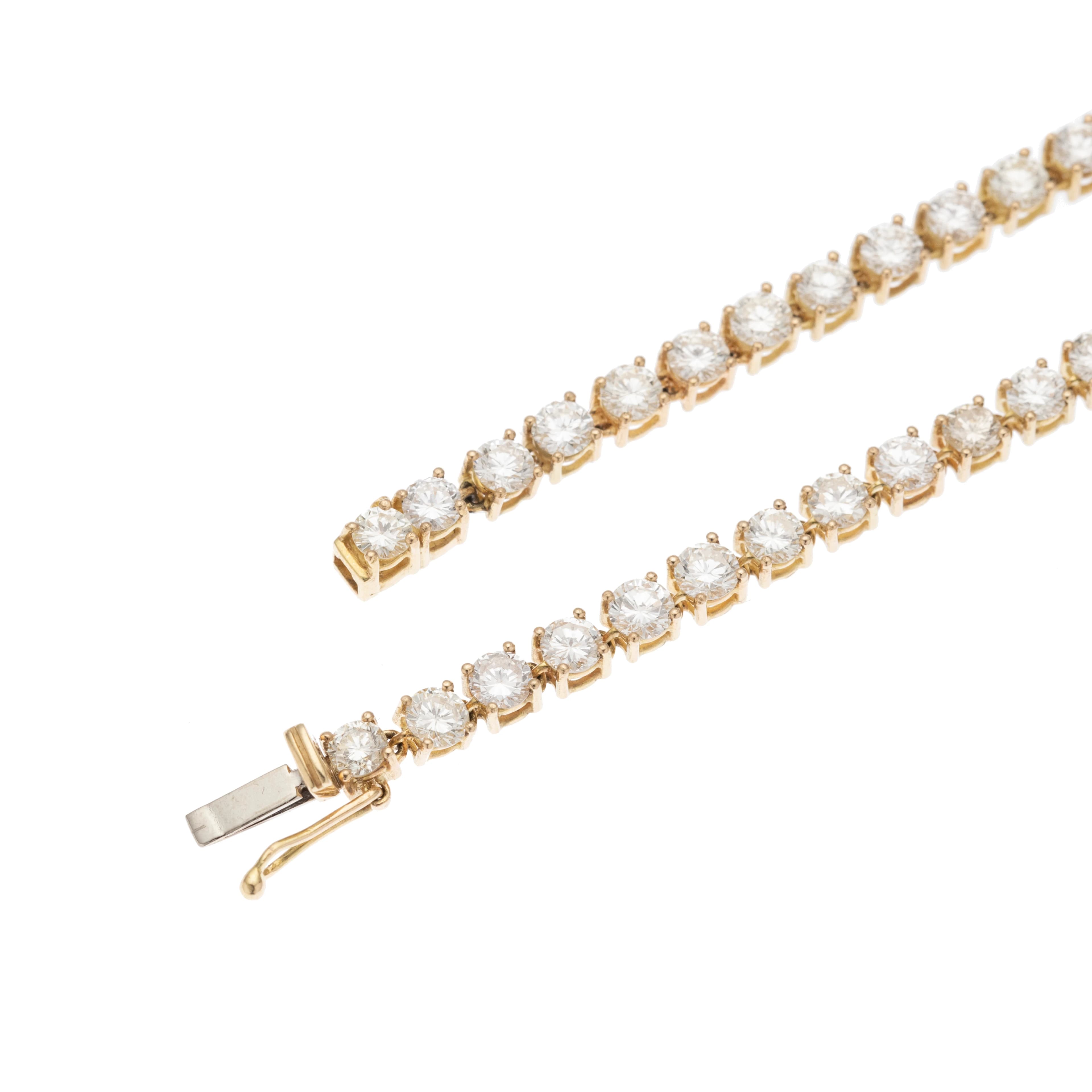 Ein klassisches Tennisarmband, gefertigt aus 750er Gelbgold. In gleichmäßiger Harmonie sind 40 funkelnde Brillanten mit einem Gesamtgewicht von 7,91 ct in Krappen gefasst. Das Zusammenspiel aus warmem Gold und lebendigem Diamantfeuer wirkt sehr edel.