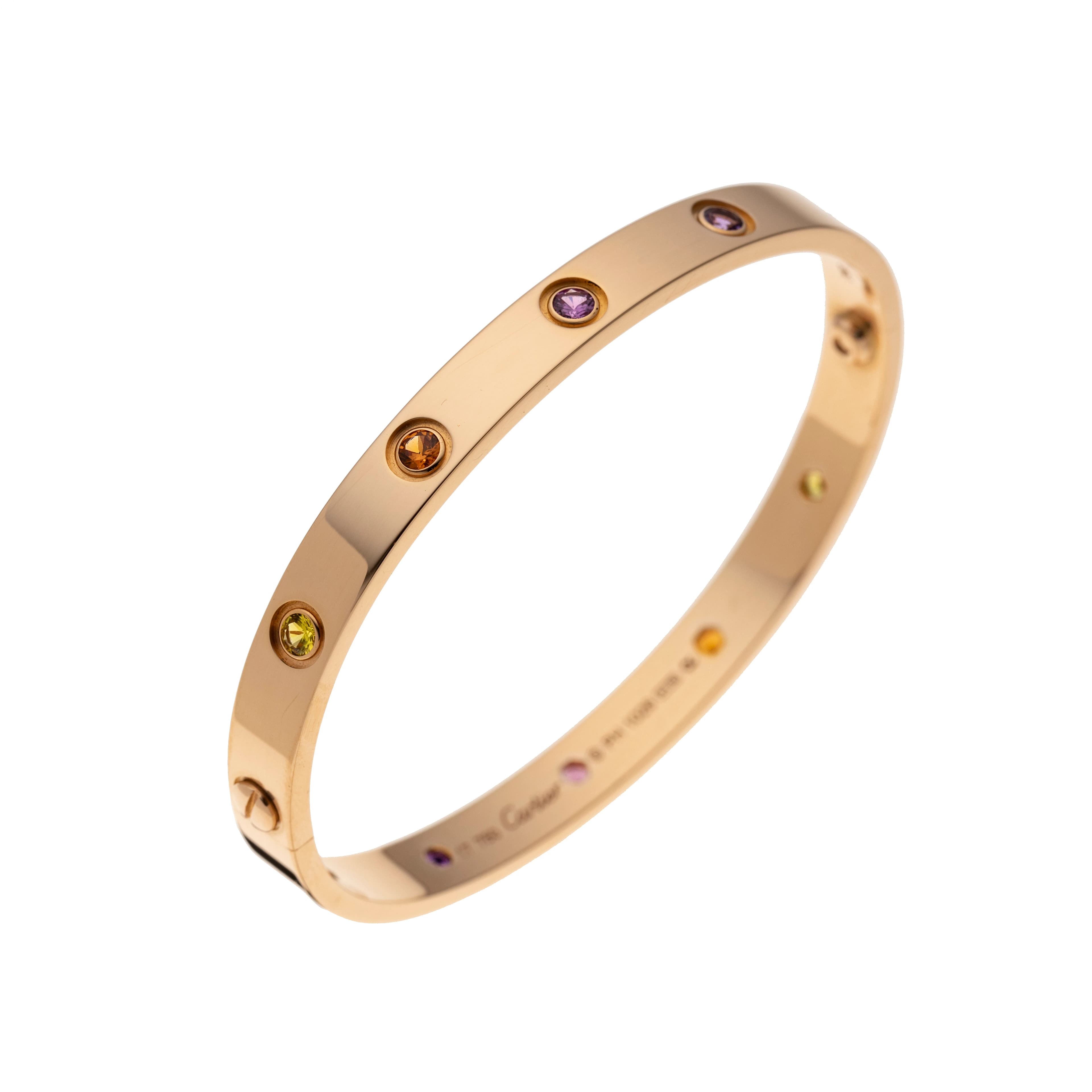 Cartier Love Armreif mit bunten Farbedelsteinen. Gefertigt aus hochwertigem 750er Roségold, besticht dieser Armreif durch funkelnde Saphire in verschiedenen Farbnuancen, die harmonisch verteilt sind. Das ikonische Design mit den charakteristischen Schrauben und das sichere Verschlusssystem machen diesen Armreif zu einem Symbol der Liebe und Verbundenheit, das sich angenehm am Handgelenk trägt.