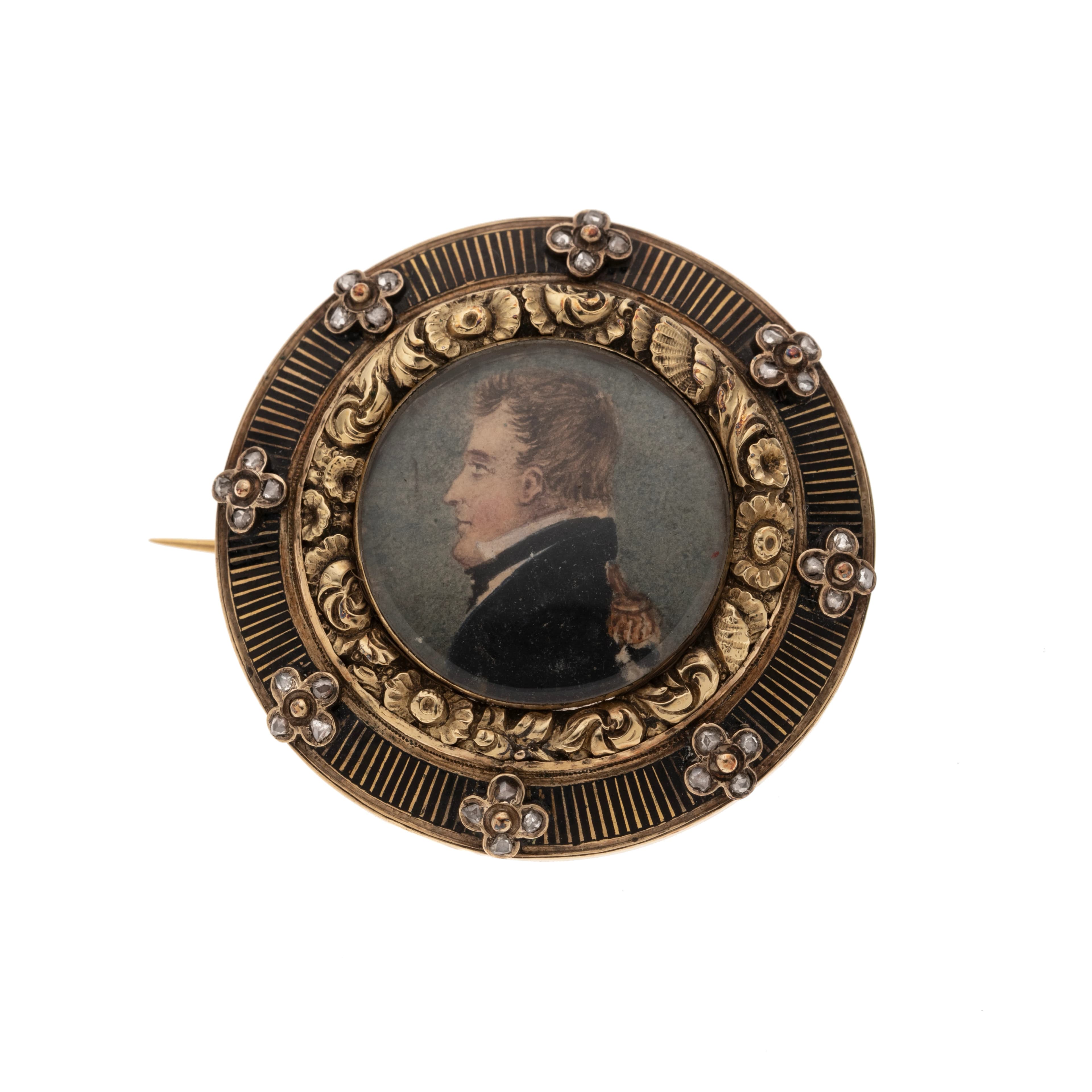 Diese runde Brosche stammt der Zeit des Biedermeier. In einem repräsentativen Rahmen zeigt sie das Miniaturporträt des nach links blickenden, jungen Napoléon. Die doppelte Rahmung bietet viel Platz für Ornament und ist reich mit Rocaillen sowie auf zweiter Ebene acht kleinen Blütenelementen mit Diamantrosen auf gestreiftem/ geriffeltem teils emaillierten Grund verziert. Rückseitig kann in eine eingearbeitete Fassung/ ein kleines Fach, ein Gedenkobjekt (Bild, Haarlocke o.ä) eingesetzt werden.