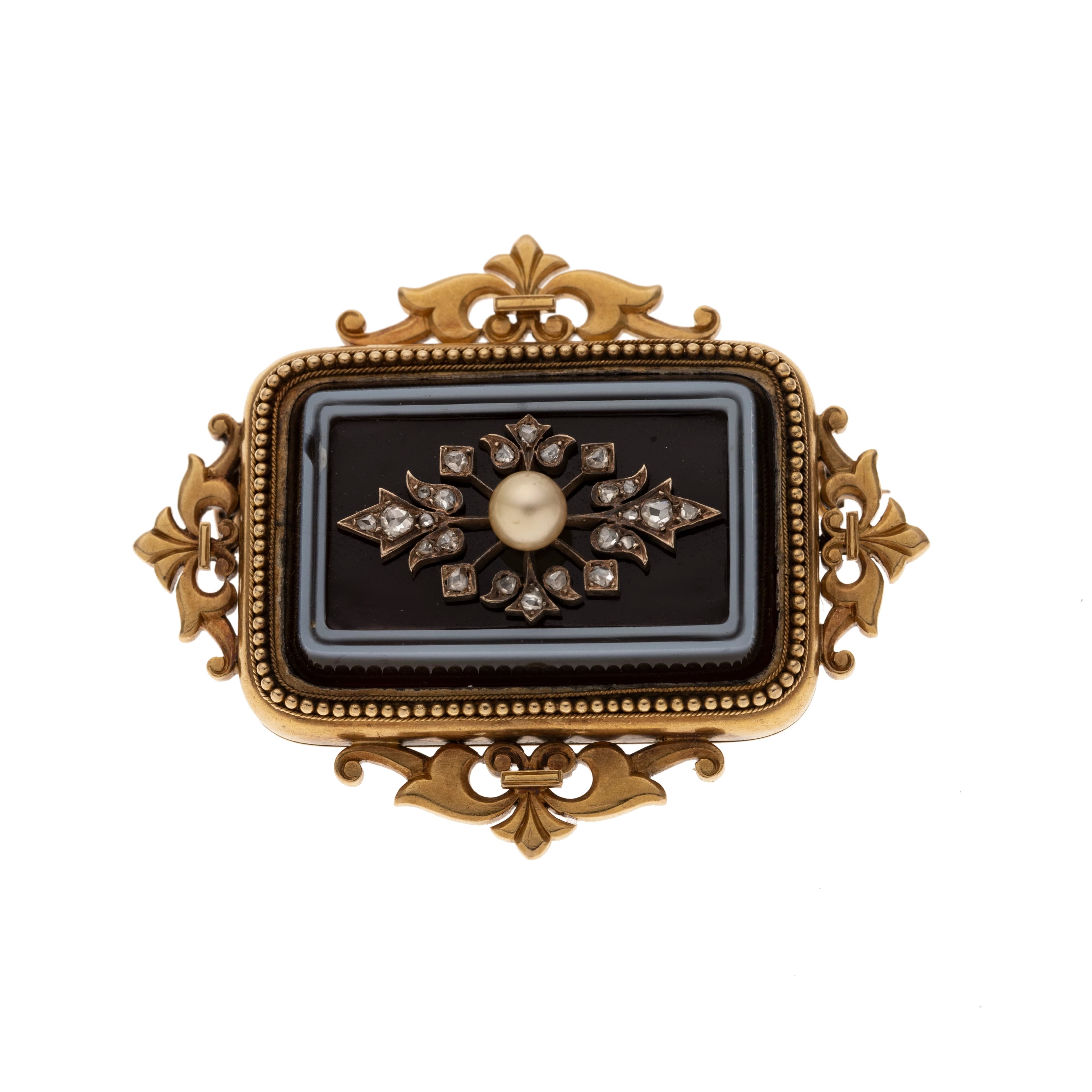 Eine rechteckige Brosche aus dem Historismus, deren goldener Rahmen von einem Perlrand und zarten Palmetten verziert ist. Gefasst ist ein Lagenstein, der im Zentrum ein florales Element besetzt mit 23 Diamantrosen und einer Perle trägt. Es entsteht eine schöne Tiefenwirkung durch den Kontrast zwischen dem geheimnisvoll funkelnden mittigen Bouquet, der lackartigen Oberfläche des Lagensteins sowie deren zarten Linien in Hellblau.