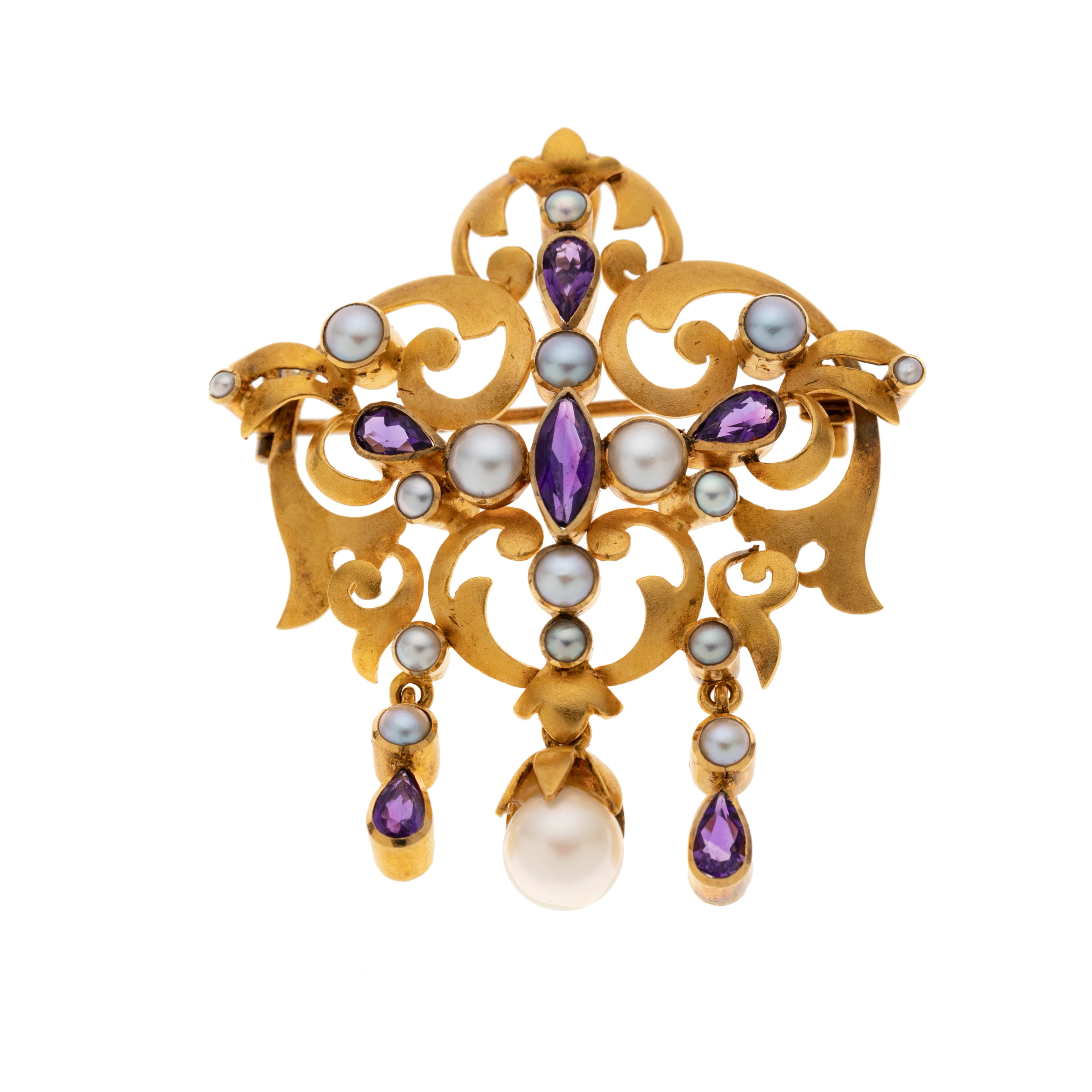 Diese spätviktorianische Anhängerbrosche aus Porto besteht aus warm schimmerndem Gelbgold, kunstvoll durchbrochen und mit geschwungenen, symmetrischen Ornamenten versehen. Mehrere Amethyste in unterschiedlichen Schliffen (navette-, tropfenförmig und oval) sorgen für kräftige violette Akzente. Das Oberteil der Brosche ist breit und symmetrisch gestaltet, mit einer Art kreuzförmigen Struktur aus Perlen und Amethysten im Zentrum. Von der unteren Partie hängen drei kleine Pendants – jeweils mit Perlen und tropfenförmigen Amethysten – herab, die der Brosche Bewegung und Eleganz verleihen.