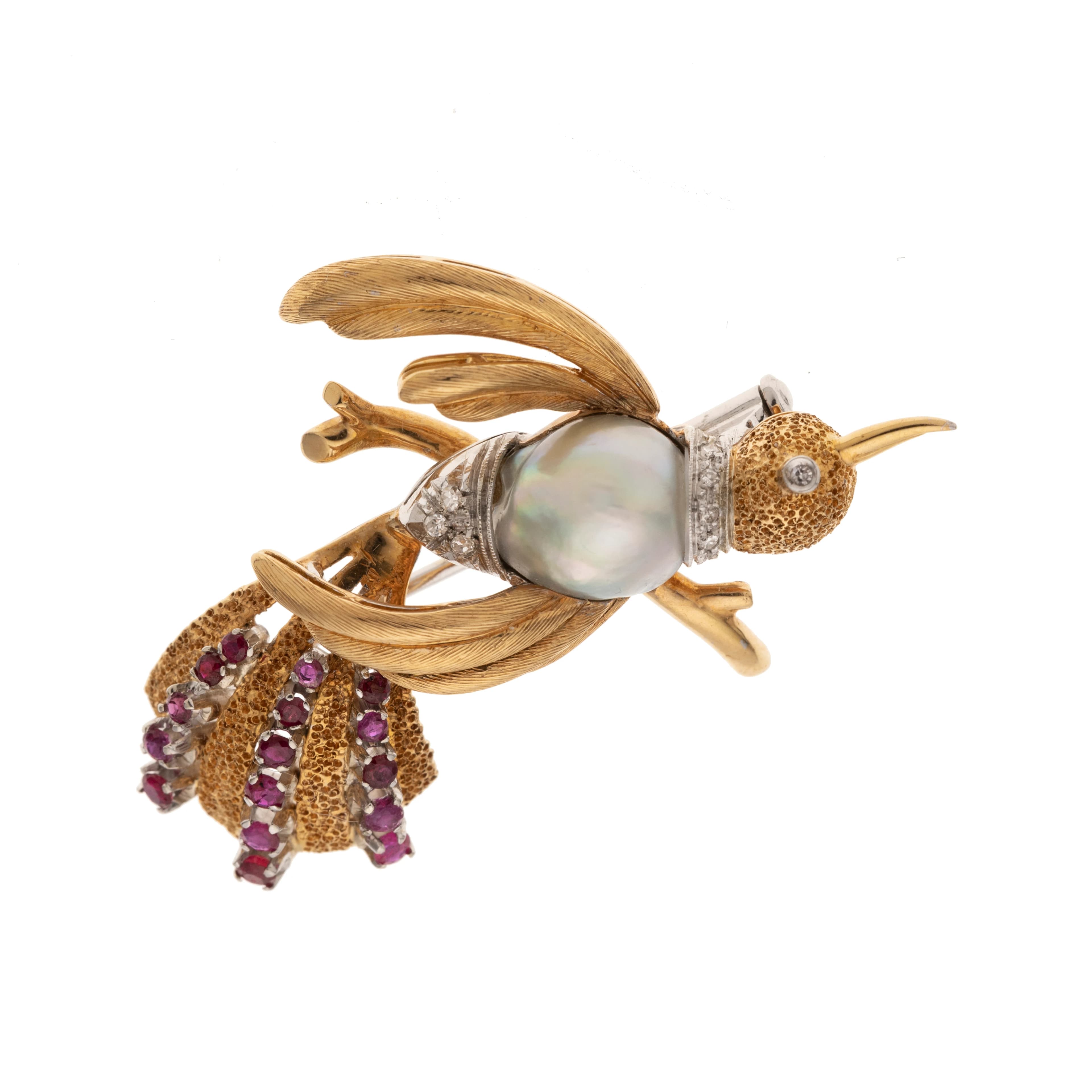 Eine Tierbrosche zeigt einen Vogel, der auf einem Ast sitzt. Sein Bauch wird von einer Südseeperle gebildet; die langen Schwingen scheinen zum Abflug bereit. Den breitgefächerten Schweif zieren 16 Rubine und weitere Teile des kleinen Körpers sind mit 9 Achtkant-Diamanten geschmückt.