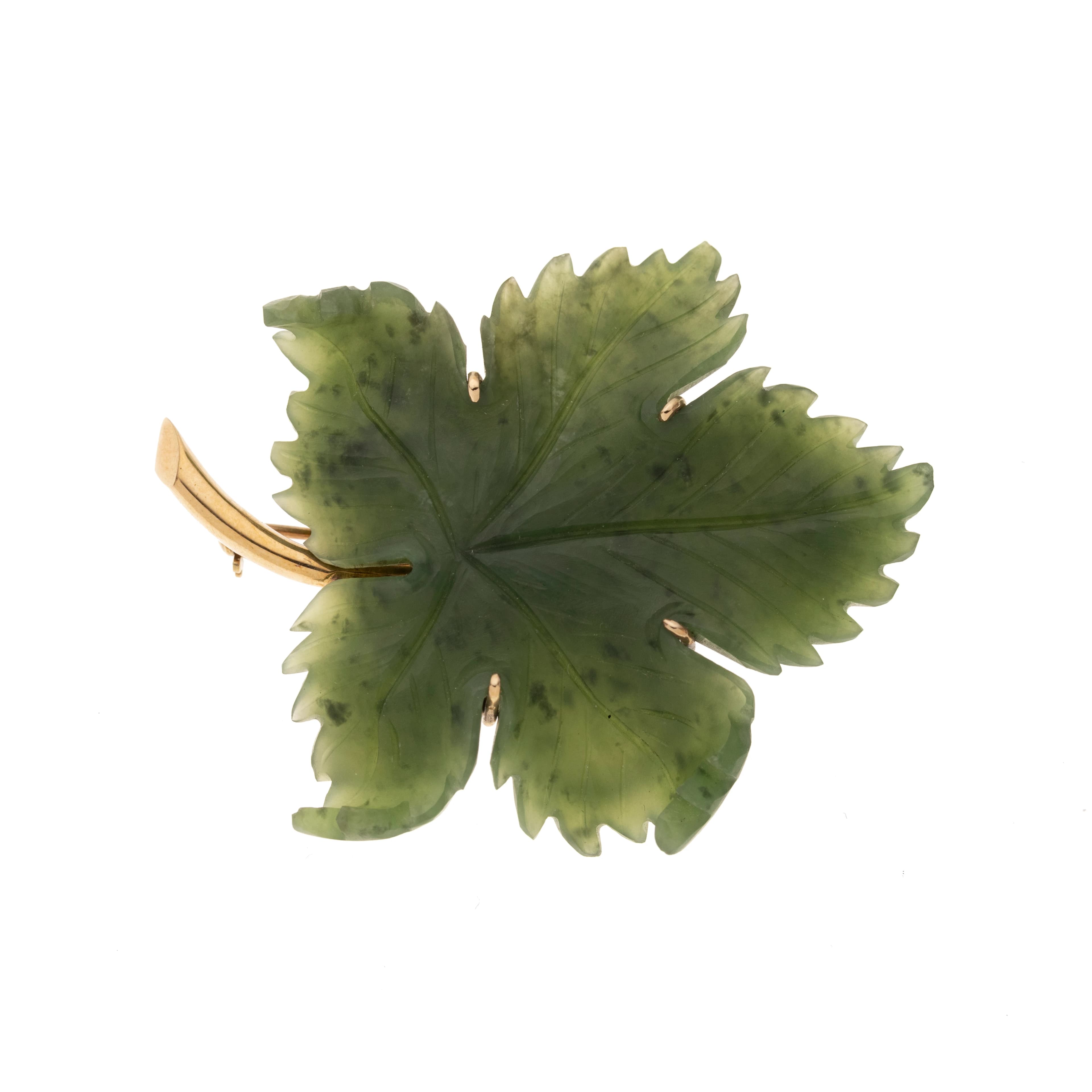 Diese repräsentative Brosche zeigt ein schön geschnittenes Weinblatt aus Jade. Zart sind die filigranen Blattadern in seine Oberfläche geschnitzt und betont die einfache Schönheit der Natur. Rückseitig findet sich ein eleganter Gelbgold-Rahmen in stilisierter Blattkontur, der die Jade über Krappen fixiert.
