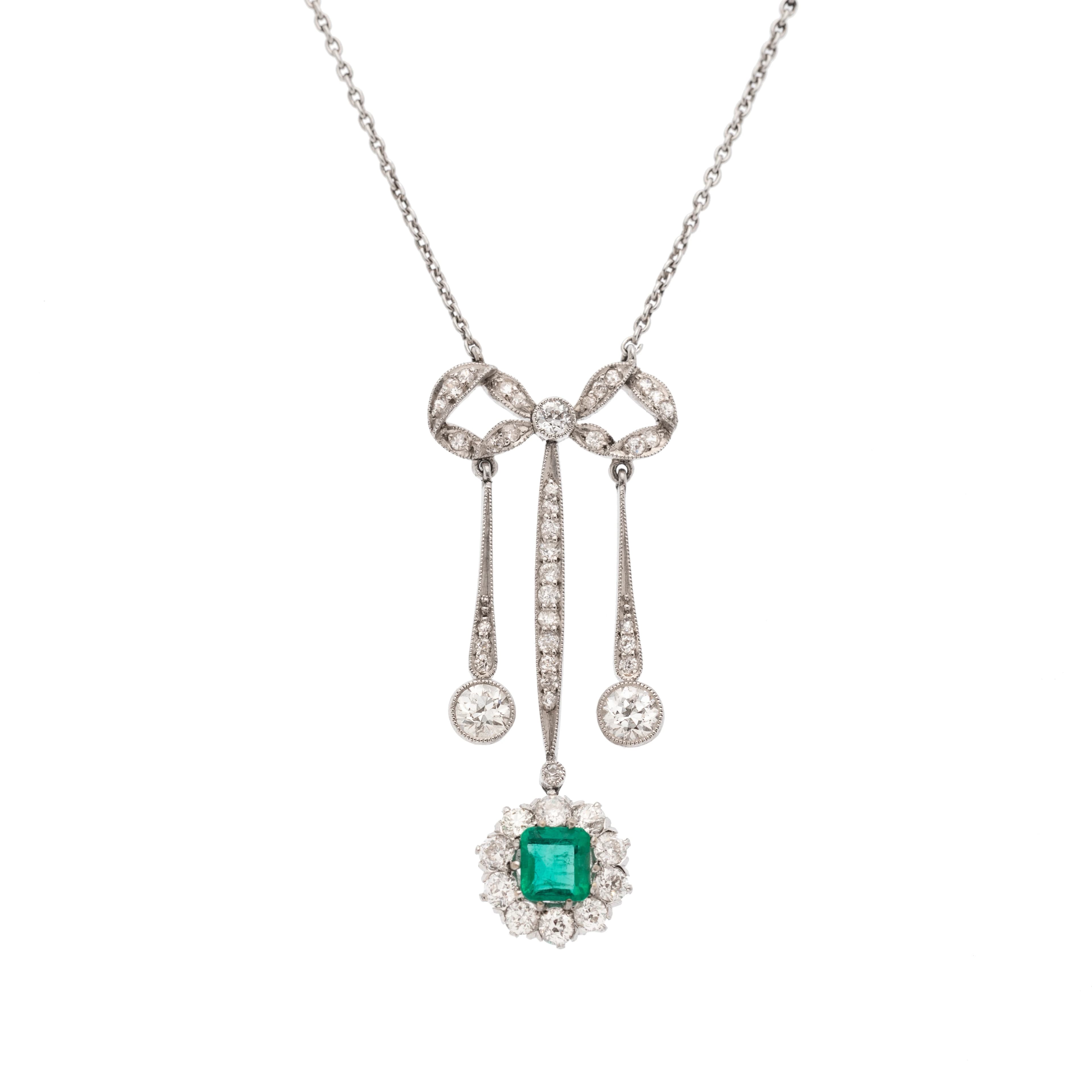 An einem zarten Ankerkettchen sitzt mittig ein Schleifenanhänger, besetzt mit 48 Altschliffdiamanten, von dem ein von Diamanten gerahmter leuchtender Smaragd im Emeraldcut herabgleitet. Rechts und links schwingen diamantbesetzte Schleifenbänder. Es handelt sich um ein typisches Motiv des Art Deco.