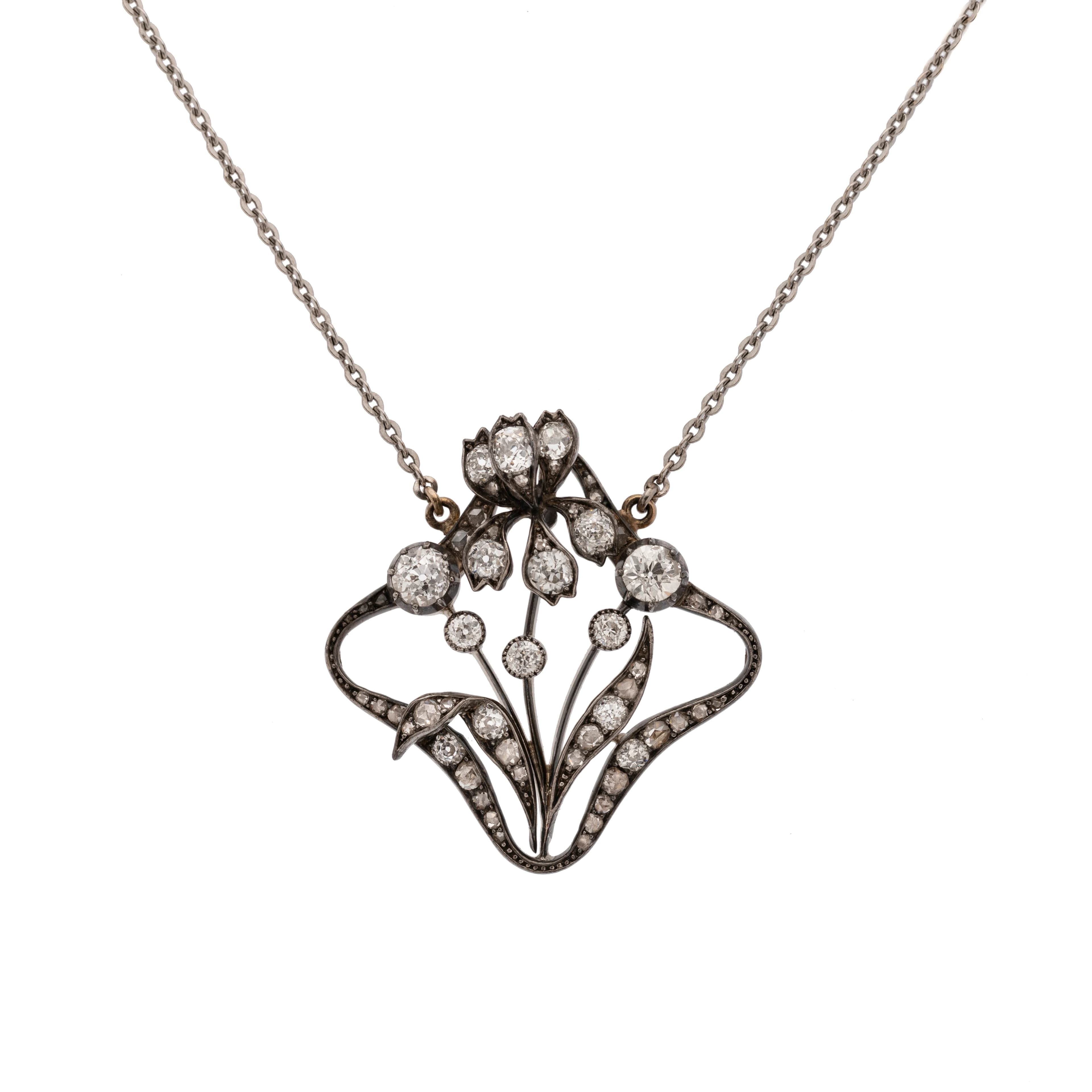 Jugendstil-Collier, punziert Wien um 1890. An einer zarten Ankerkette ist ein florales, goldverbödetes Mittelstück abgehängt. Die leicht wirkende Gestaltung von Blüten, Knospen und Blättern in Rautenform ist besetzt mit 14 Altschliffdiamanten von insgesamt ca. 1,5 ct, I-J/ vs2-si2 und 39 Diamantrosen inges. ca. 0,25 ct. Vgl. Rühle-Diebener Schmuck von 1900-1980, S. 27