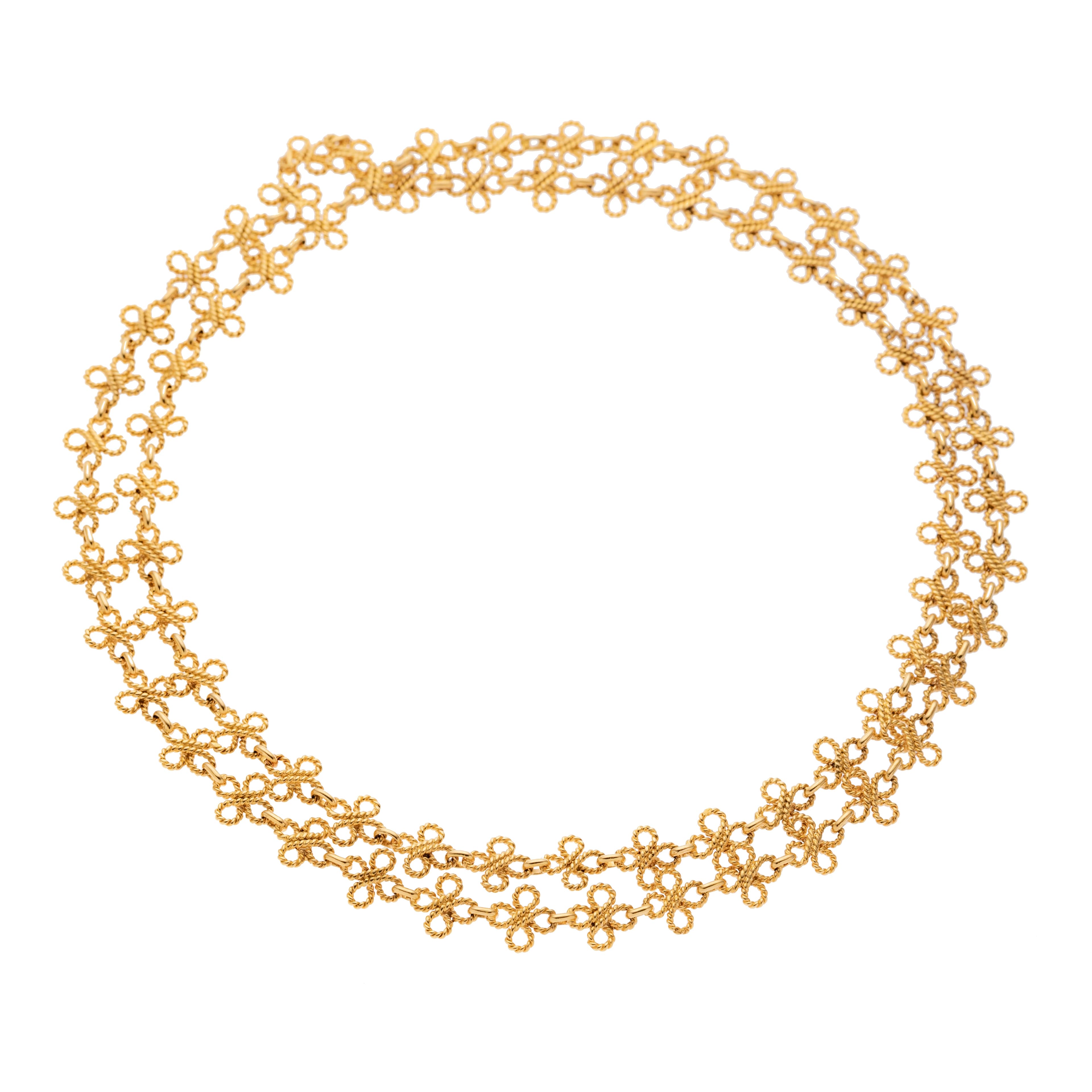 Diese endlose gearbeitete Fantasiekette besteht aus vierpassigen Elementen aus Kordeldraht, die elegant durch glatte Ösen miteinander verbunden sind. Der Vierpass als künstlerisches Motiv aus vier sich überschneidenden Bögen sorgt für eine harmonische, ornamentale Wirkung.