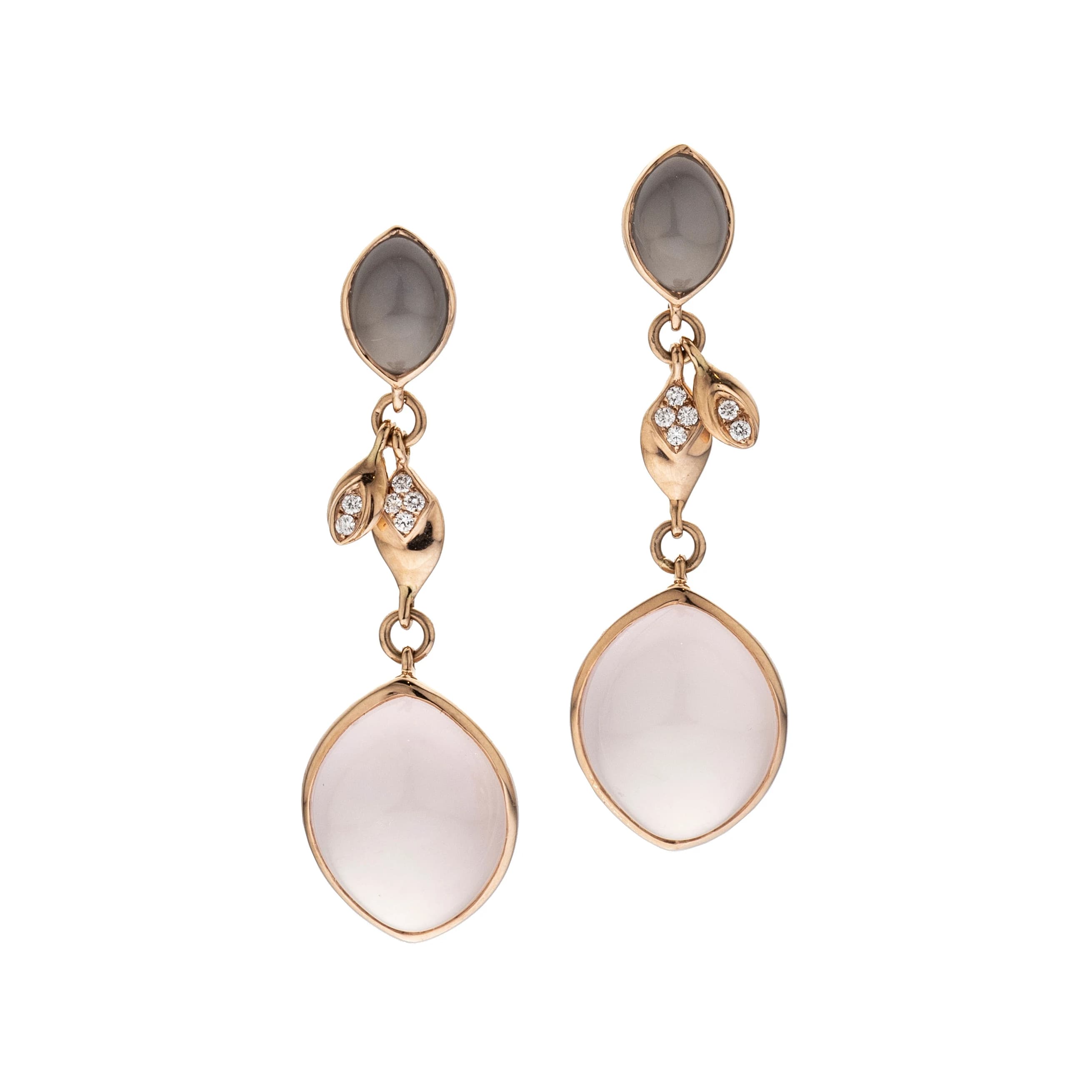 Dieses verspielte Paar Ohrgehänge gefertigt aus Roségold, kombiniert je einen navetteförmigen, grauen Mondstein mit je zwei kleinen, diamantbesetzten, herabhängenden Blattelementen sowie einem folgenden größeren, navetteförmigen Rosenquarz-Cabochon.