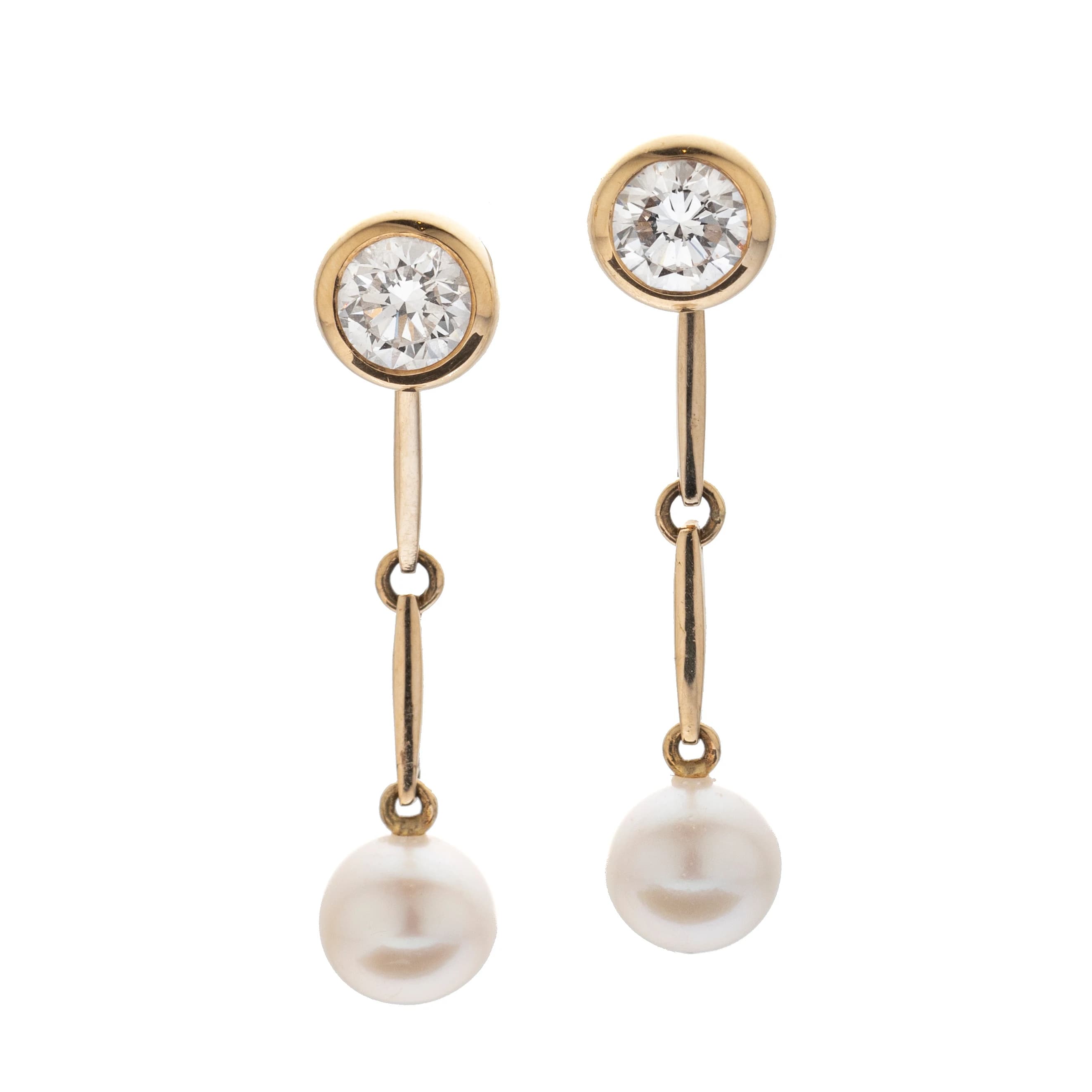 Diese Ohrstecker mit Brillanten und an Stegen herabhängenden Akoya-Zuchtperlen lassen sich sowohl lang als auch kurz tragen. Die beiden einkarätigen Brillanten können ein- und ausgefädelt werden und kommen auch solo wunderbar zur Geltung.