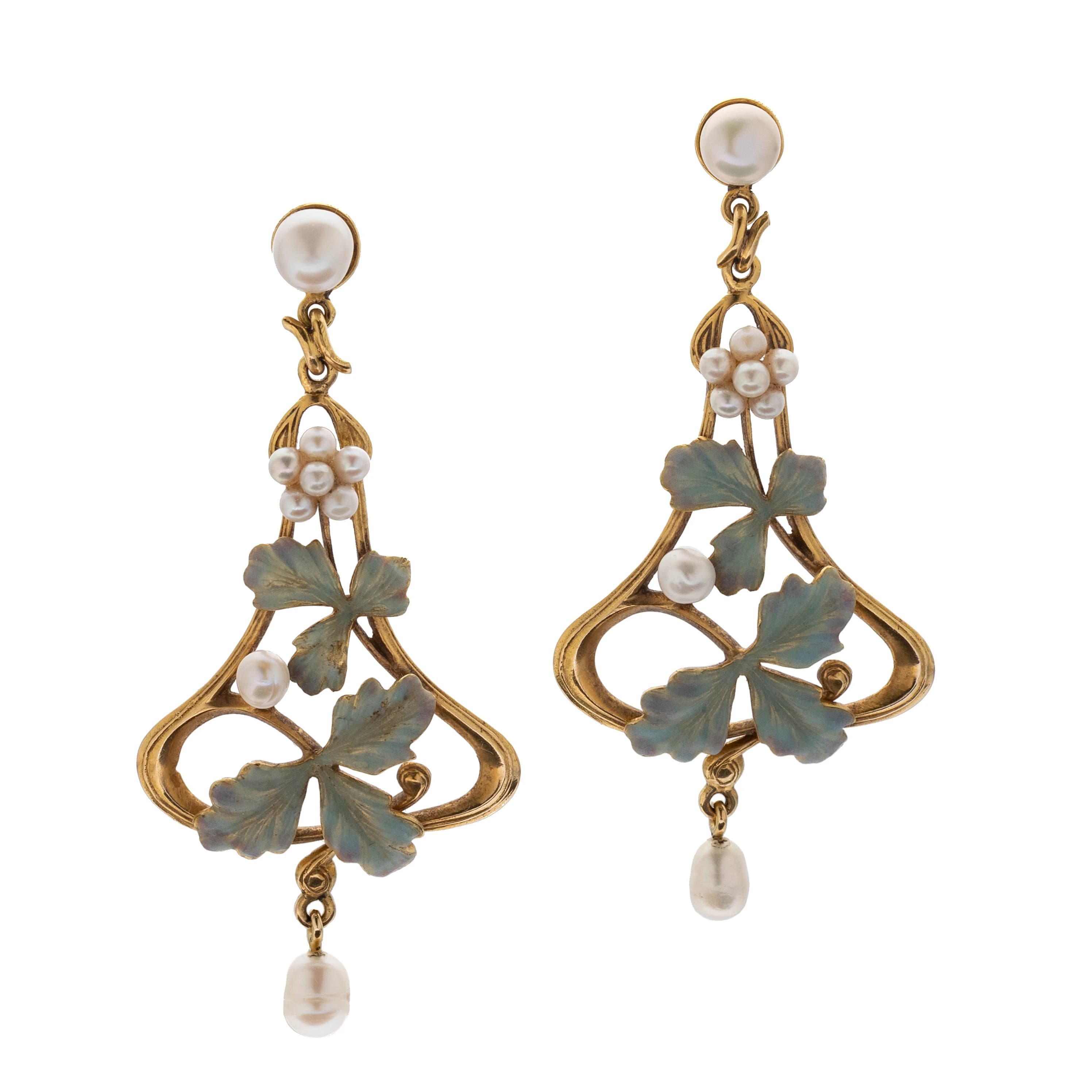 Diese tropfenförmigen Ohrgehänge verkörpern das charakteristische Design des Jugendstils: Jede Seite zeigt eine geschwungene, teils emaillierte Blumenranke mit einer Blüte aus Perlchen und einem Perlbutton am Stecker. Eine ovalen, herabhängende Perle bildet den eleganten Abschluss. Ausgestattet mit modernen Rücksteckern.