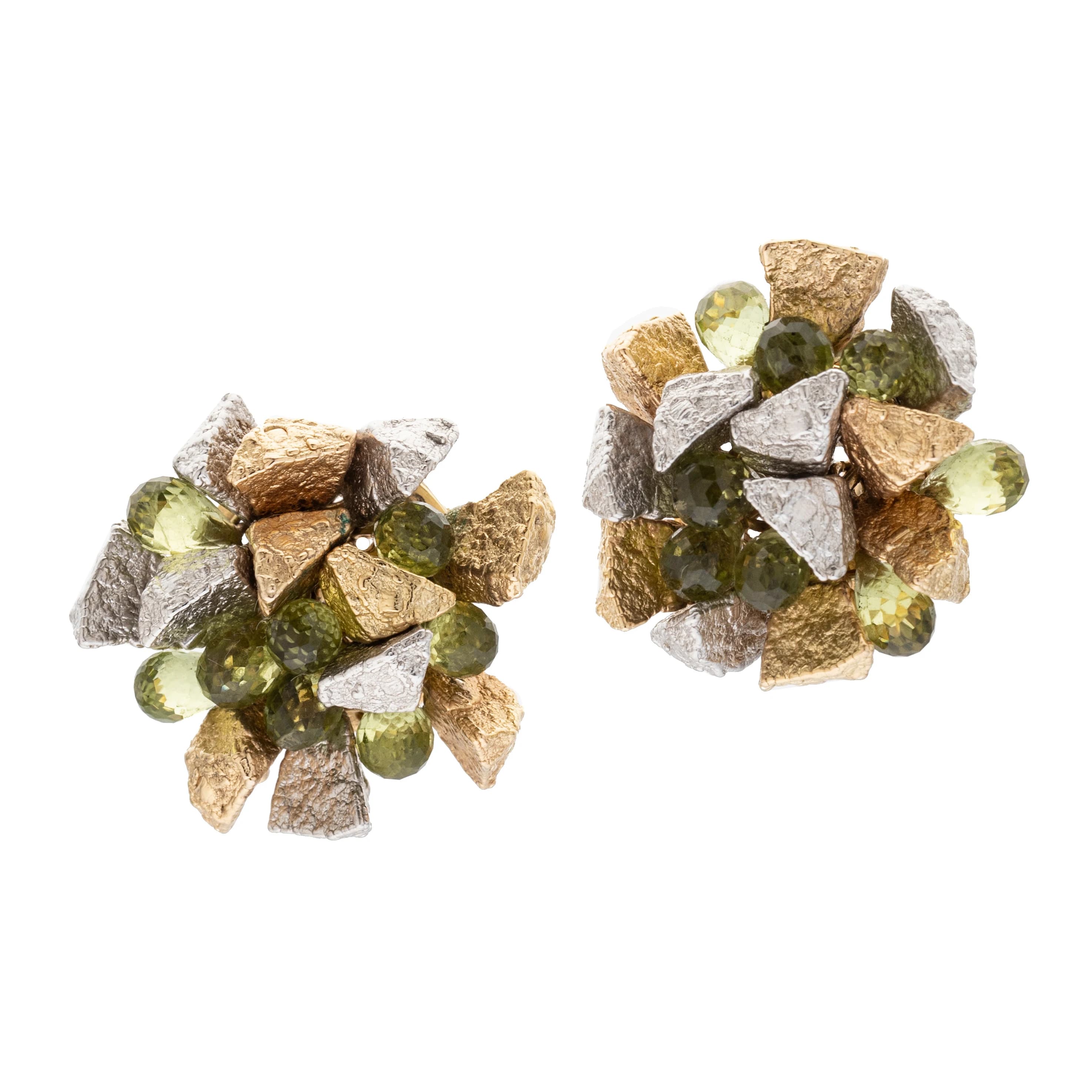 Diese außergewöhnlichen Ohrsteckerclips vereinen Gelb- und Weißgold in einer interessanten Nugget-Optik. Zwischen den Goldformen sind acht Peridot-Pampeln fixiert, die dem Design eine frische Farbigkeit verleihen. Ein Schmuckstück, das Extravaganz und Originalität verbindet.