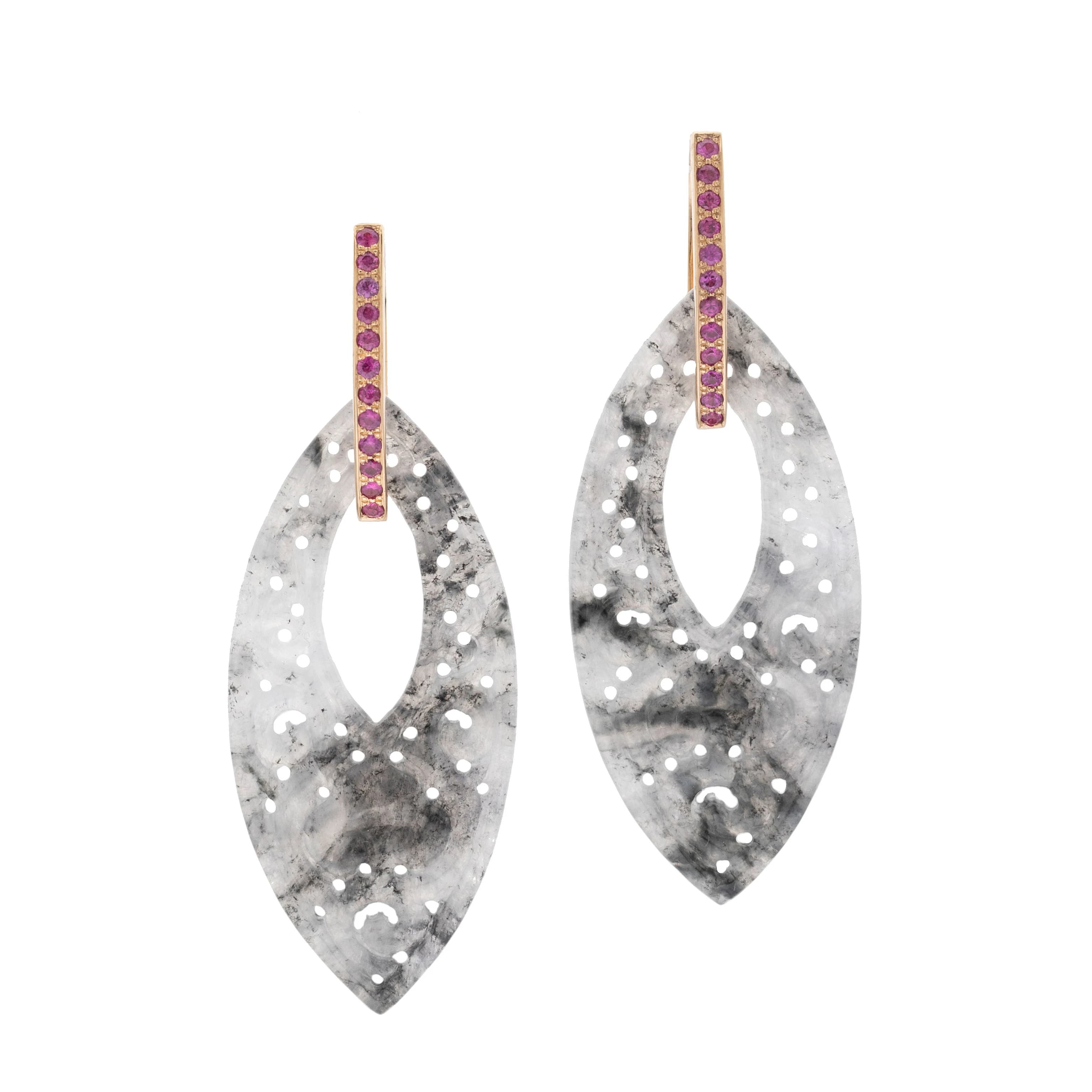 Diese spitz zulaufenden Creolen aus Roségold sind mit jeweils zwölf leuchtenden Rubinen besetzt, die dem Design eine lebendige Farbigkeit verleihen. Zwei fein geschnitzte graue Jadescheiben in elliptischer Marquiseform, variabel in die Creolen einhängbar, greifen die Form der Creolen auf und vollenden das harmonische Zusammenspiel von Ober- und Unterteil.