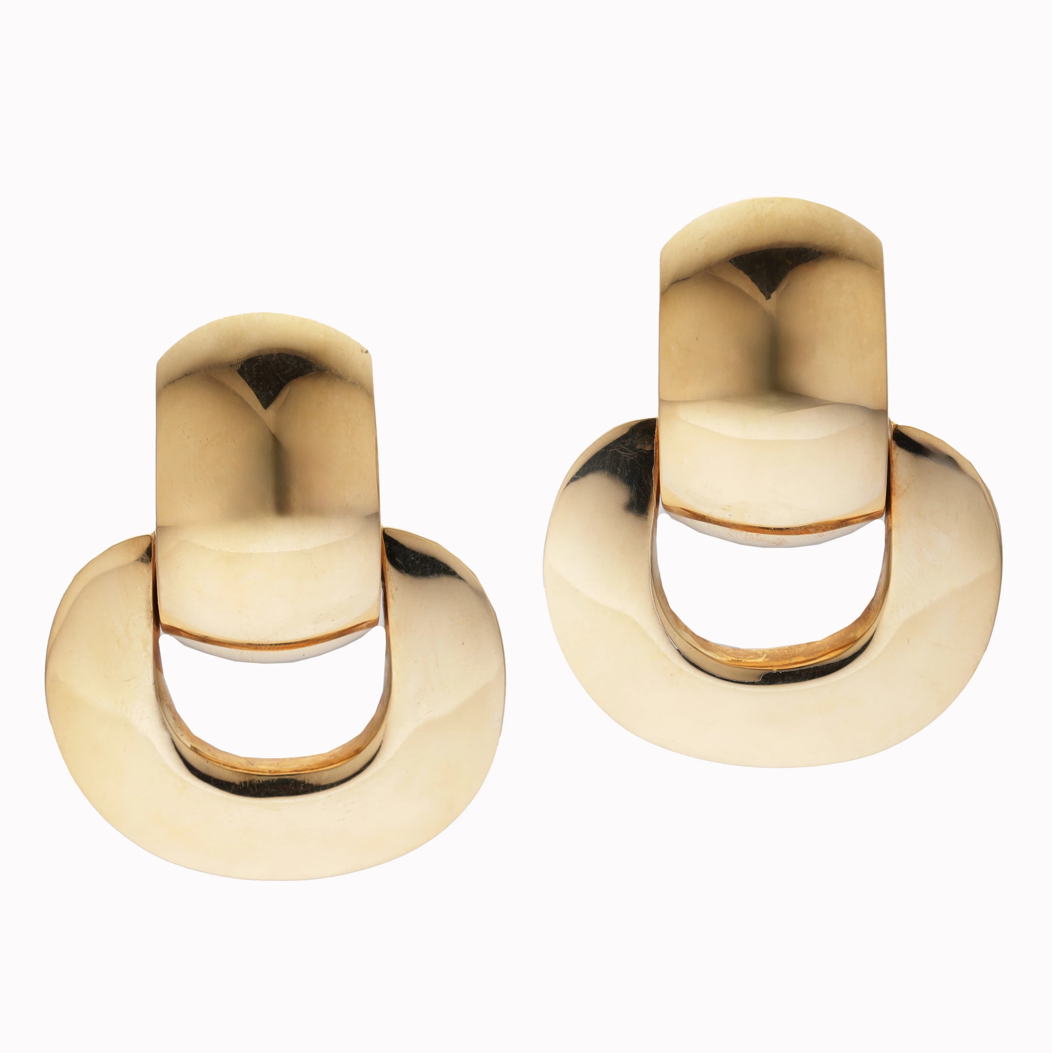 Dieser plastisch gestaltete, voluminöse Ohrschmuck der 50er/ 60er Jahre verbindet eine kompakte, quaderförmige Front mit einer darunter angeordneten, offen gearbeiteten Rundform. Hochglanzpolierte Oberflächen unterstreichen die weichen Übergänge und die ausgewogenen Proportionen des Designs.