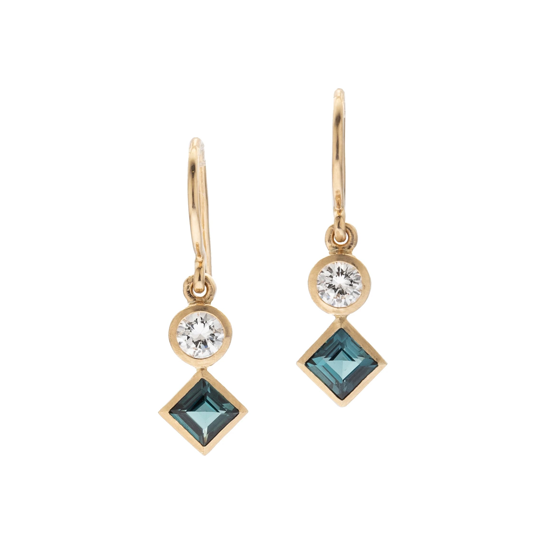 Diese zarten Ohrhänger aus Gelbgold bestechen durch ihre schlichte Eleganz und Bewegung. Jeder Ohrring zeigt einen Brillanten in einer feinen Zargenfassung, unter dem ein spitz gestelltes Turmalin-Carree gefasst ist. Ein Schmuckstück, das Leichtigkeit, Farbe und Strahlkraft vereint.