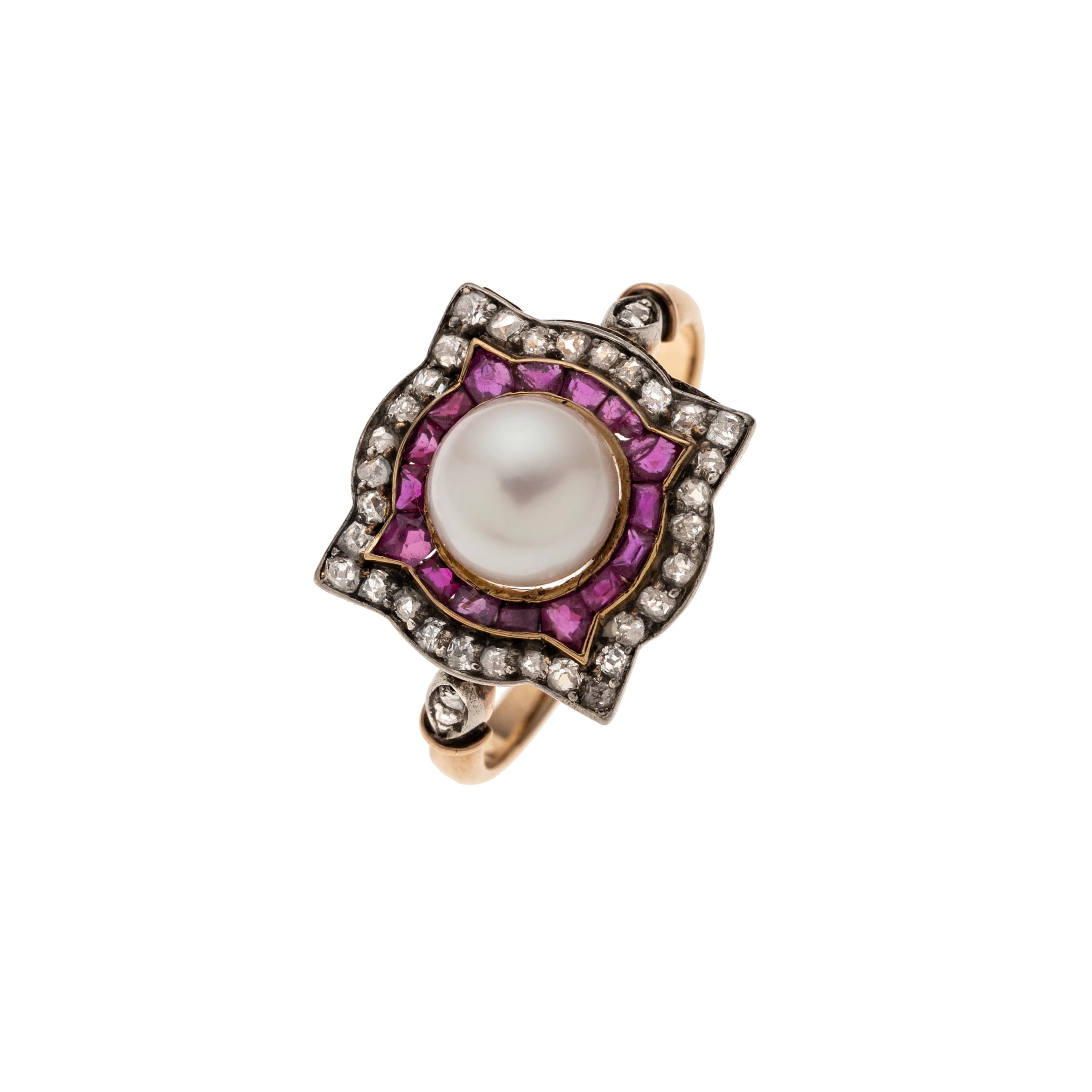 Dieser Art Deco Ring besticht durch seinen spitzkissenförmigen Ringkopf, der die geometrische Dominanz der Epoche widerspiegelt. Im Zentrum ruht eine Akoya-Zuchtperle, umgeben von 16 Rubinen, die mit ihrem leuchtenden Rot das reine Weiß der Akoya unterstreichen. Die Außenform wird von 32 Diamantrosen zart umrahmt und die Ringschultern von jeweils zwei weiteren Diamanten markiert.
