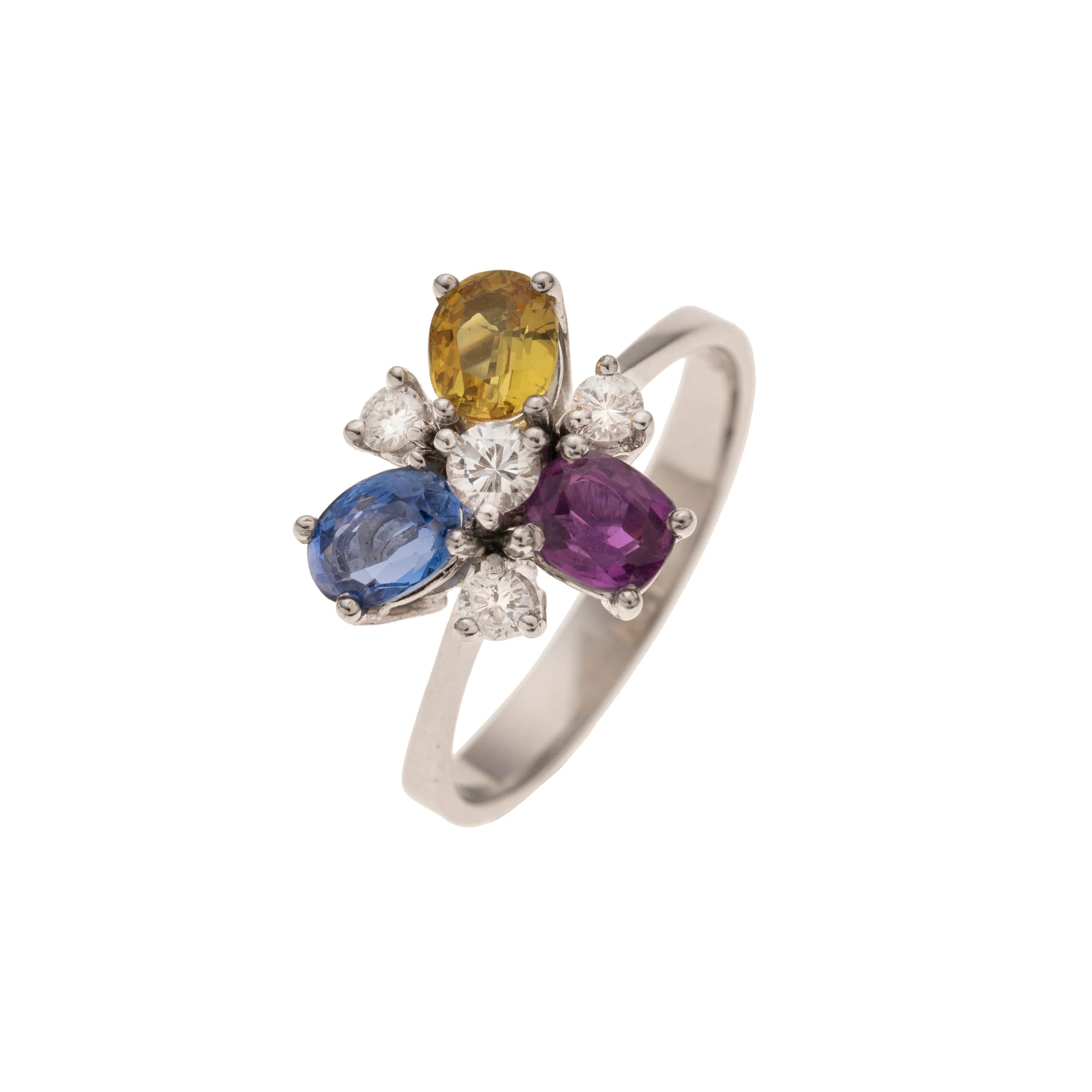 An einer zarten Weißgoldringschiene sind ein blauer, gelber und rosafarbener Saphir kleeblattartig um einen zentralen Brillanten arrangiert. Zwischen den Korunden schmiegt sich jeweils ein weiterer kleiner Brillant. Ein farbenfrohes Ensemble.