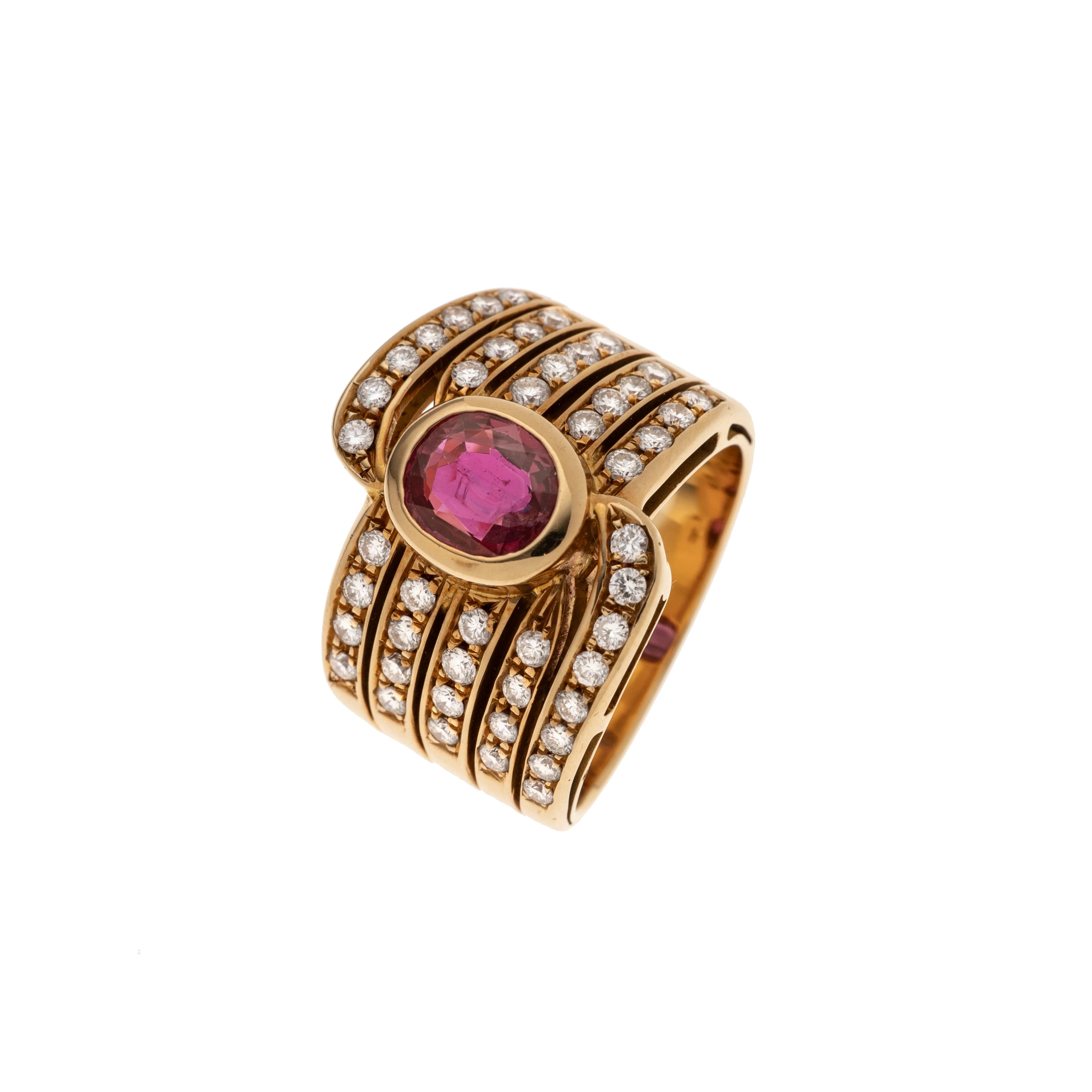 Ein glitzernder Cocktailring aus 750er Gelbgold, dessen fünf angedeutete Rippen im oberen Drittel mit 48 Brillanten von insgesamt ca. 0,96 ct besetzt sind. Im Zentrum des Rings thront ein ovaler Rubin von ca. 1,19 ct in einer Zargenfassung. Ein opulentes Schmuckstück, das durch den leichten Schwung seiner Außenkanten und seiner strahlenden Brillanz sehr charmant wirkt.