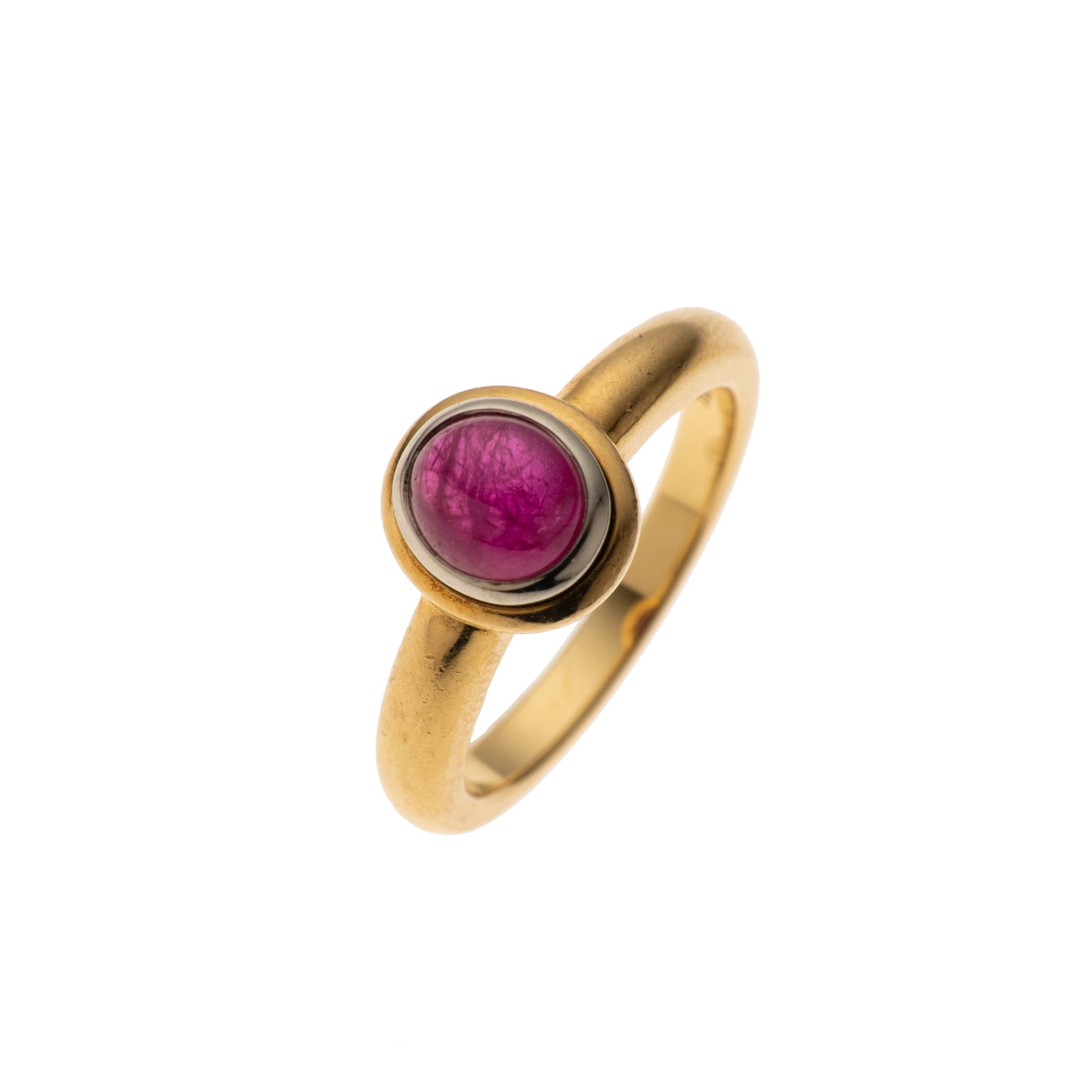 Ein feiner Ring aus poliertem Gelbgold präsentiert im Ringkopf einen intensiv leuchtenden ovalen Rubin-Cabochon, der in einer doppelten Zargenfassung aus Weiß- und Gelbgold gefasst ist. Die raffinierte Fassung unterstreicht die satte Farbe des Steins.