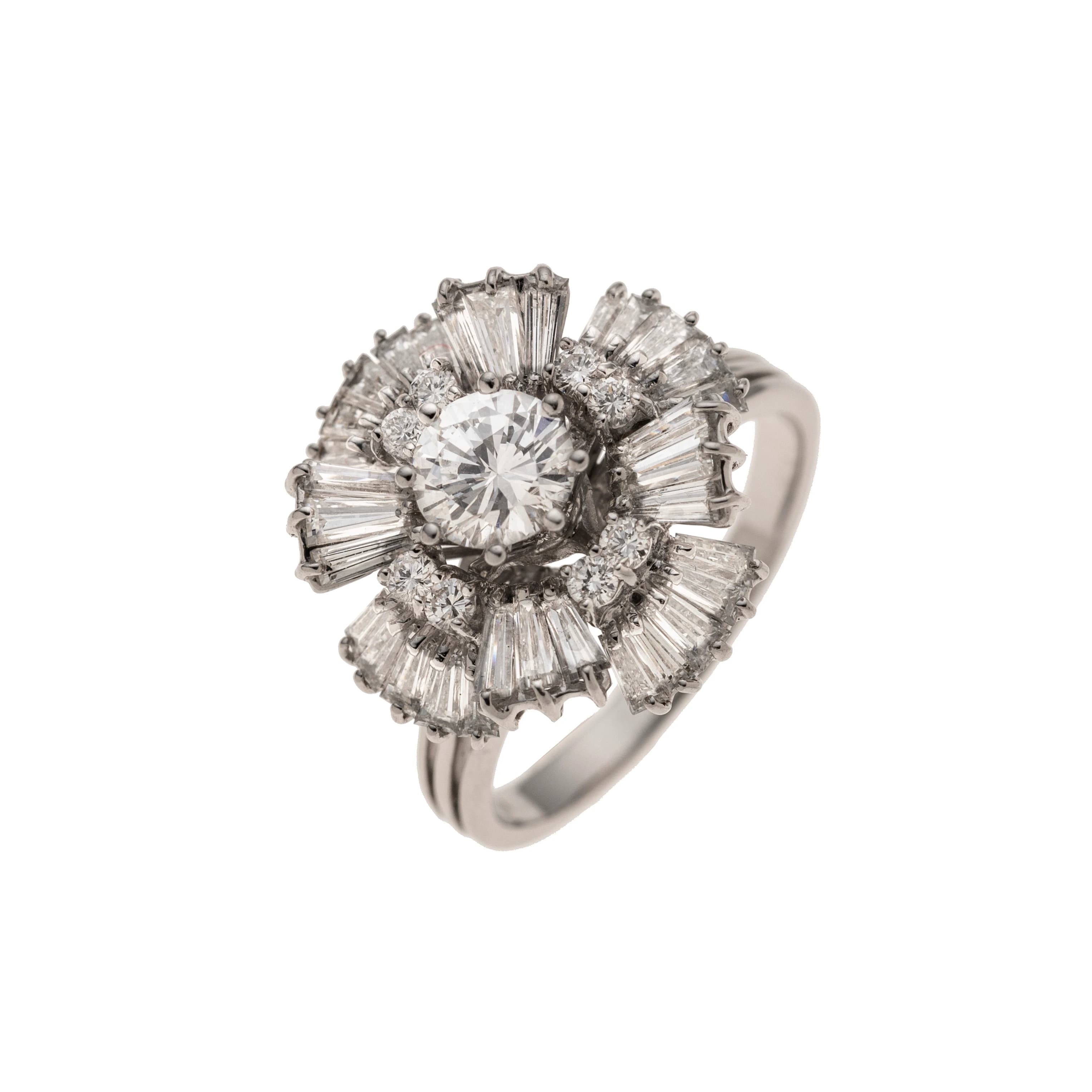 Dieser funkelnde Cocktailring aus 750er Weißgold besticht durch seine opulente Gestaltung. Im Zentrum steht ein prächtiger ca. 0,84 ct großer Brillant, an vier Seiten von je einem Paar Brillanten von insgesamt ca. 0,16 ct flankiert. Auf zwei niedrigeren Ebenen sind 32 Diamanten im Trapezschliff von ca. 0,76 ct blütenförmig angeordnet.