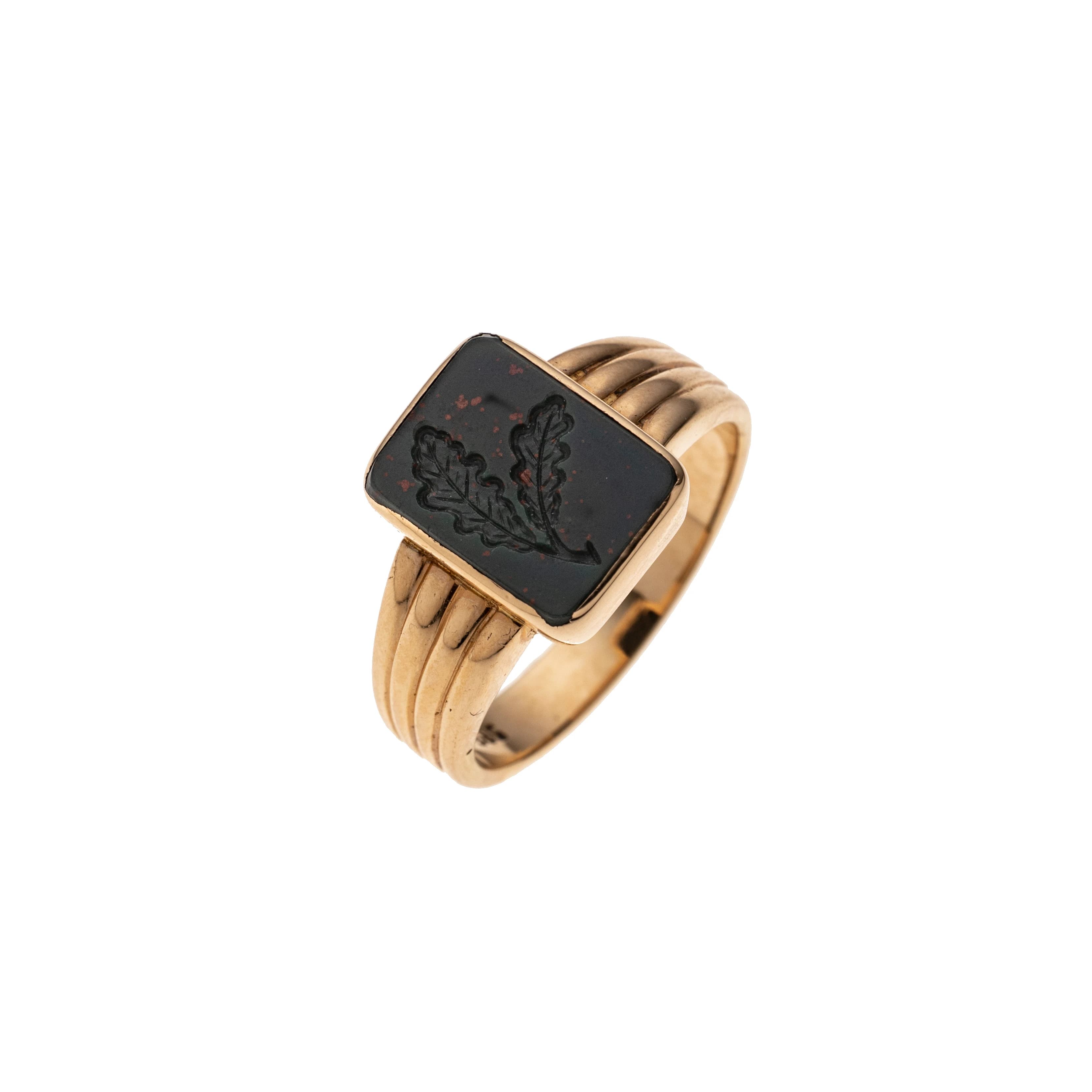 Mittig in der gerillten Ringschiene dieses besonderen Siegelrings ruht ein rechteckiger Heliotrop in einer Zargenfassung. Der charakteristische Siegelstein zeigt die feine Gravur eines Paares Eichenblätter, die dem Schmuckstück eine natürliche Symbolik verleihen. Die feinen kunstvoller Steingravur bildet einen charmanten Kontrast zu den parallelen Furchen des Goldes.
