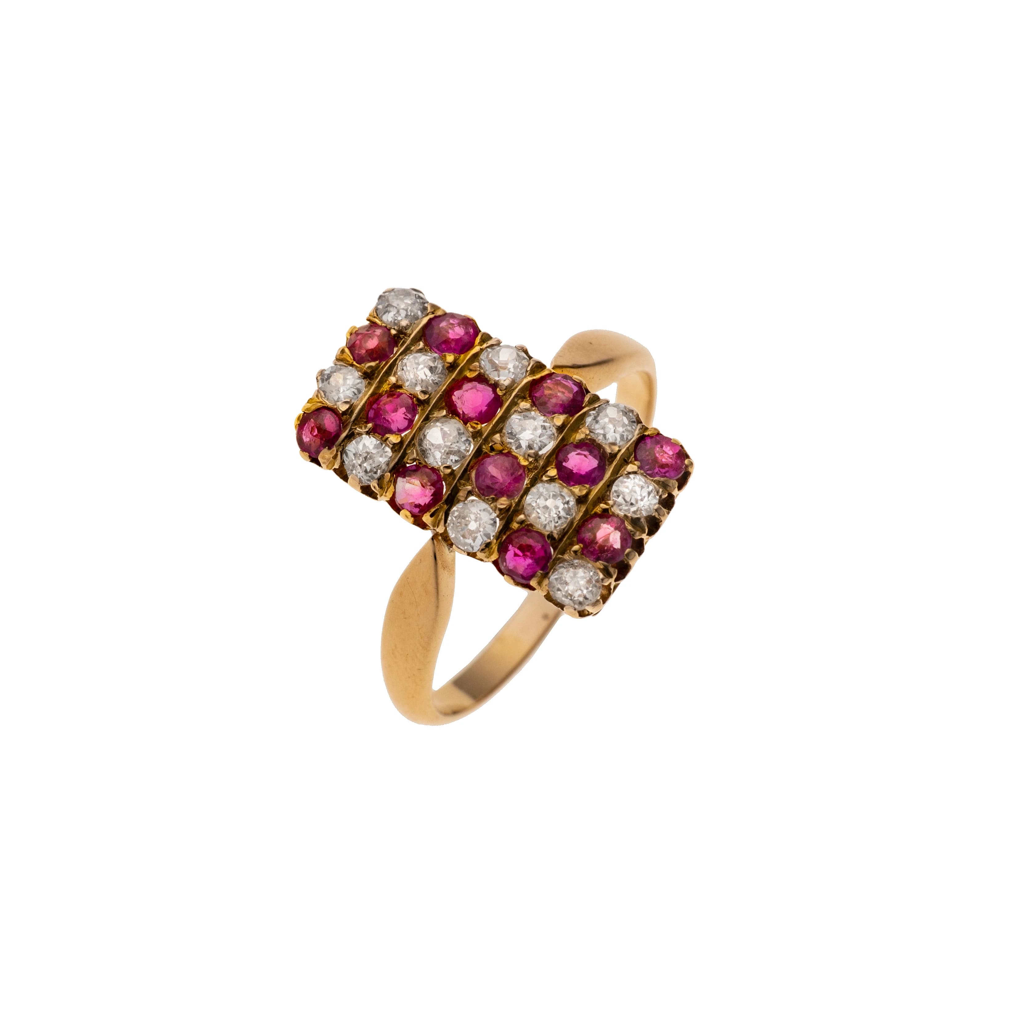 Ein Damenring gefertigt aus 750er Roségold mit einem rechteckigem Ringkopf, der in einem schachbrettartigen Muster mit zwölf Rubinen von insgesamt ca. 0,54 ct und zwölf Diamanten von insgesamt ca. 0,48 ct besetzt ist. Das harmonische Wechselspiel der leuchtenden Rubine und funkelnden Diamanten macht diesen Ring zu einem wirklich besonderen Schmuckstück.