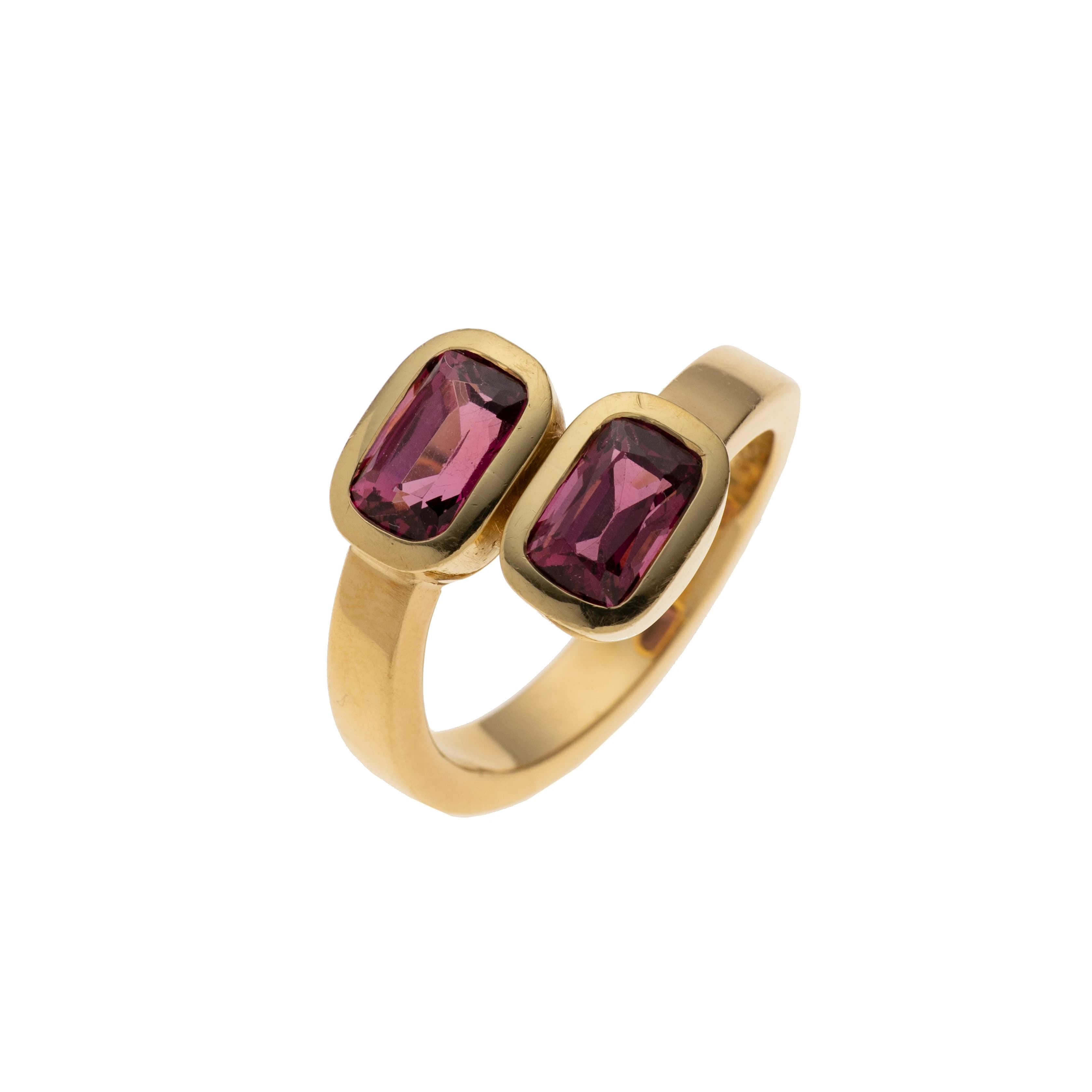 Ein offener, massiver Toi-et-moi Ring mit rechteckigem Profil, dessen nebeneinander liegende Enden den Ringkopf bilden und jeweils einen Turmalin in einer Zargenfassung präsentieren. Beide Steine sitzen in einer Zargenfassung und zeigen fein nuancierte Rot-Rosatöne. Ein Schmuckstück, welches eine dezente Farbharmonie und Puristik verkörpert.