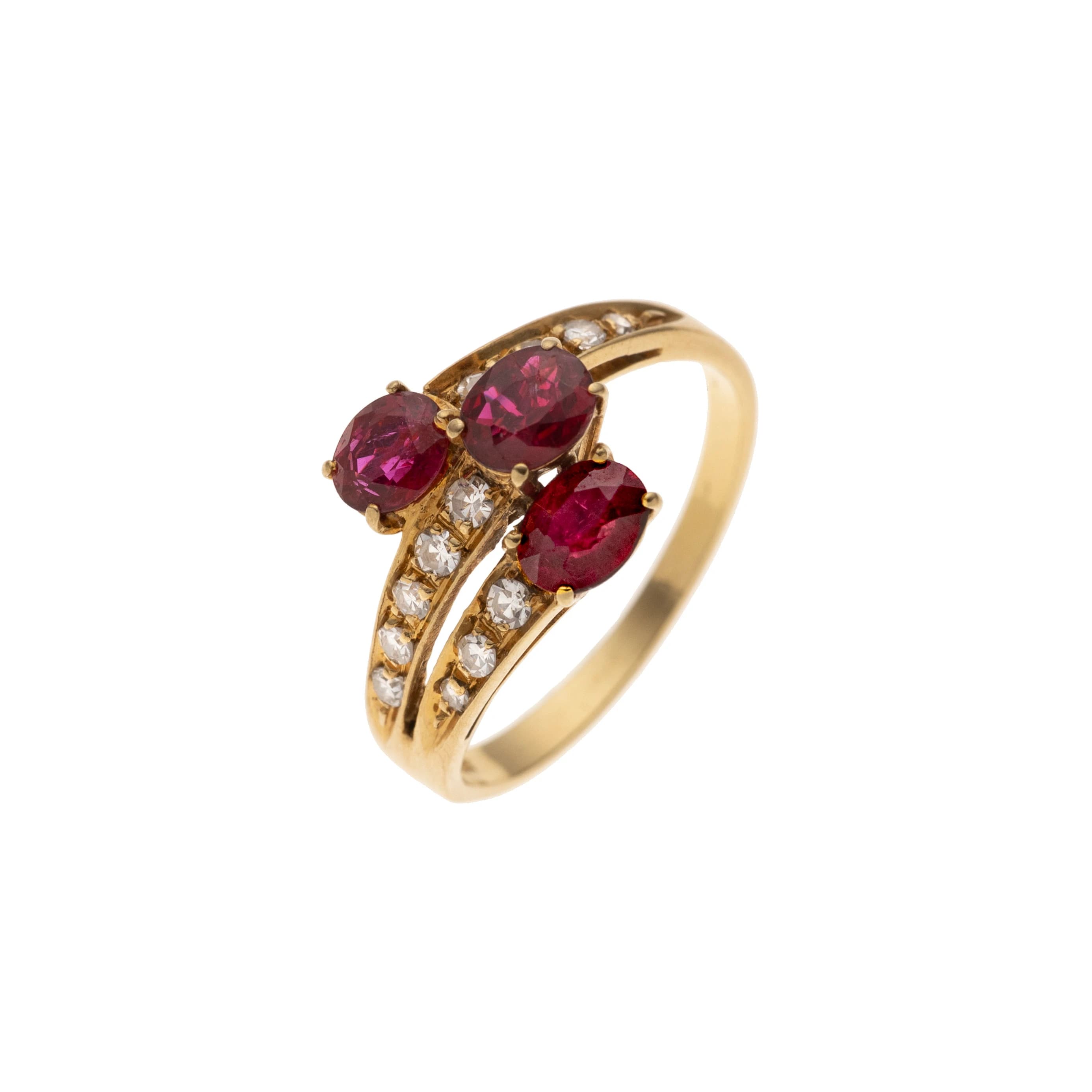 Dieser Damenring gefertigt aus 750er Gelbgold besticht durch seine schwungvoll gestaltete Ringschiene. Ein Ende ist elegant gespalten und mit zwei ovalen facettierten Rubinen sowie acht Achtkantdiamanten besetzt. Das gegenüberliegende Ende trägt vier Achtkantdiamanten und mündet in einen einzelnen, oval facettierten Rubin.