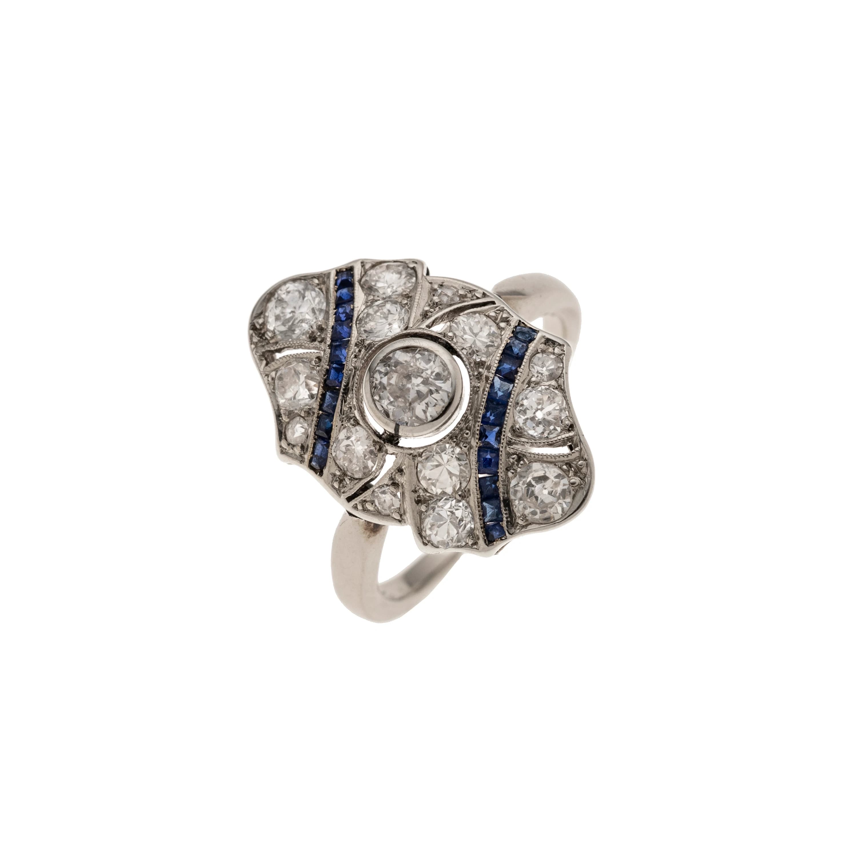 Ein eleganter Ring aus dem Wiener Art Déco. In der Mitte des ovalen Ringkopfs sitzt ein Altschliffdiamant von ca. 0,25 ct (H–I/p1) in einer Zargenfassung. Ringsum sind 14 Altschliffdiamanten mit insgesamt ca. 0,66 ct (H/si2–p1) in Millegriff-Technik gefasst und verleihen dem Ringkopf ein sanftes Funkeln. Zwei bandartige Linien, jeweils mit Saphir-Carreés besetzt, verlaufen über den Ringkopf.